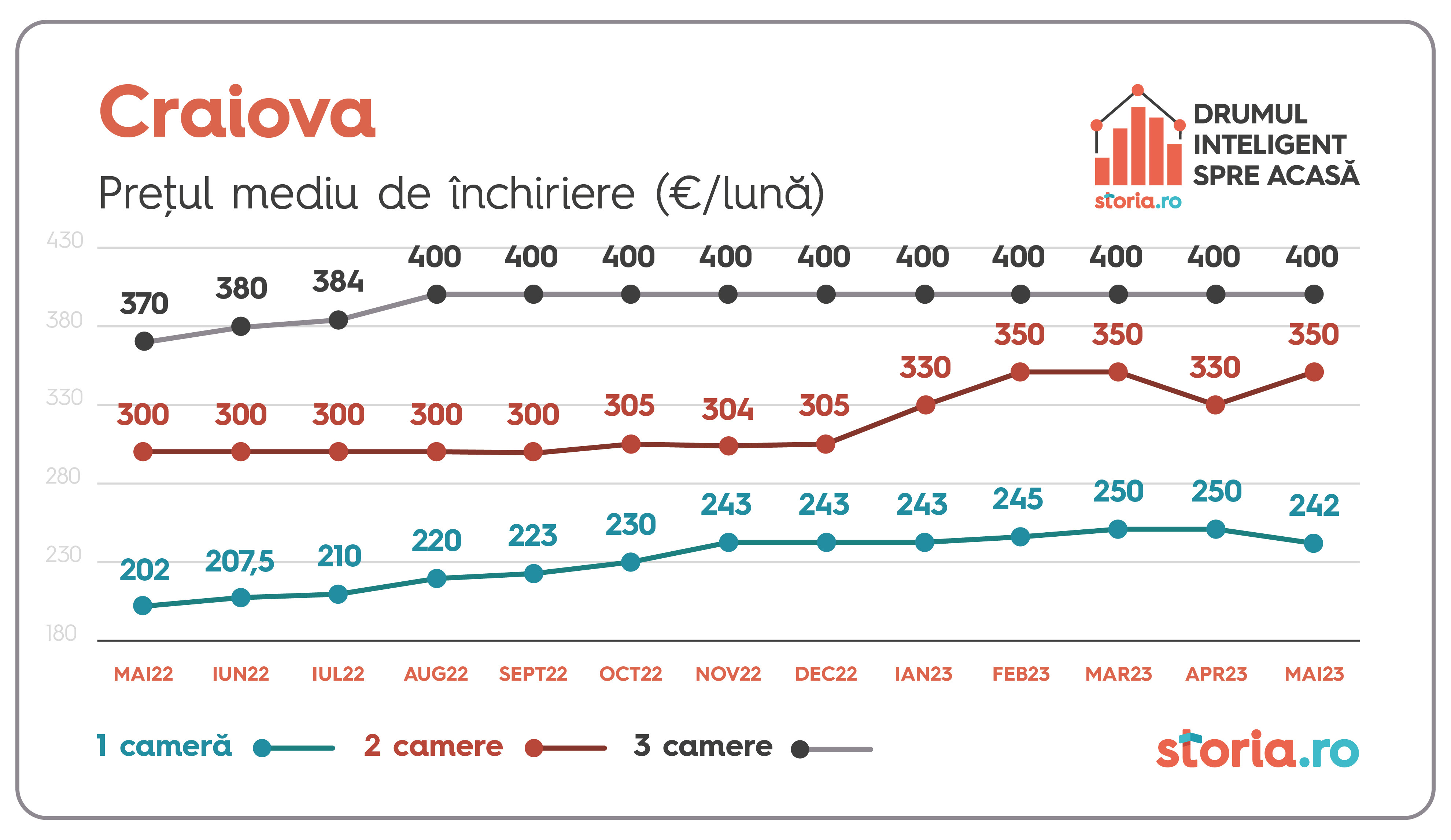 Față de luna anterioară, prețurile cerute în Craiova pentru închiriere au crescut cu 6% în cazul apartamentelor cu două camere, dar au scăzut cu 3% în categoria de garsoniere.