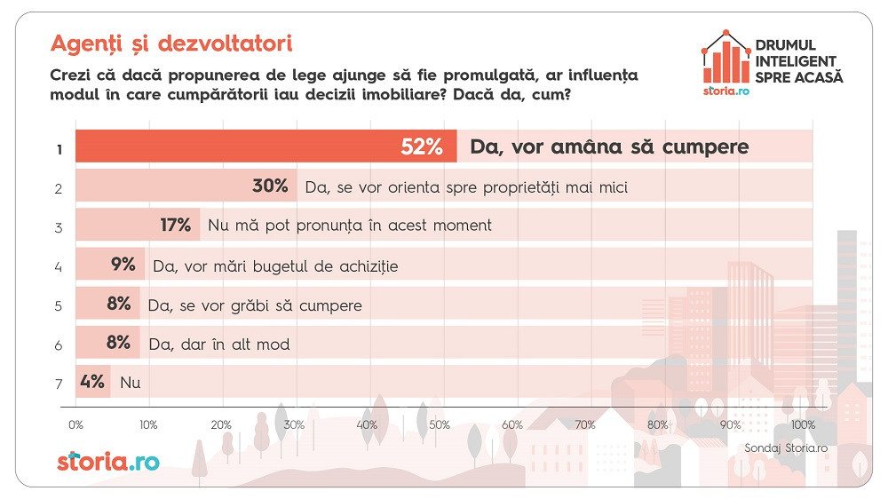 În cazul în care legea ar ajunge să fie promulgată în forma propusă în draftul de ordonanță, cei mai mulți dintre agenți și dezvoltatori sunt de părere că cei interesați de o achiziție vor amâna să cumpere o locuință (52%), în timp ce 30% consideră că aceștia se vor orienta spre proprietăți mai mici. 17% declară că nu se pot pronunța încă, în timp ce 9% se așteaptă ca viitorii proprietari să mărească bugetul de achiziție.