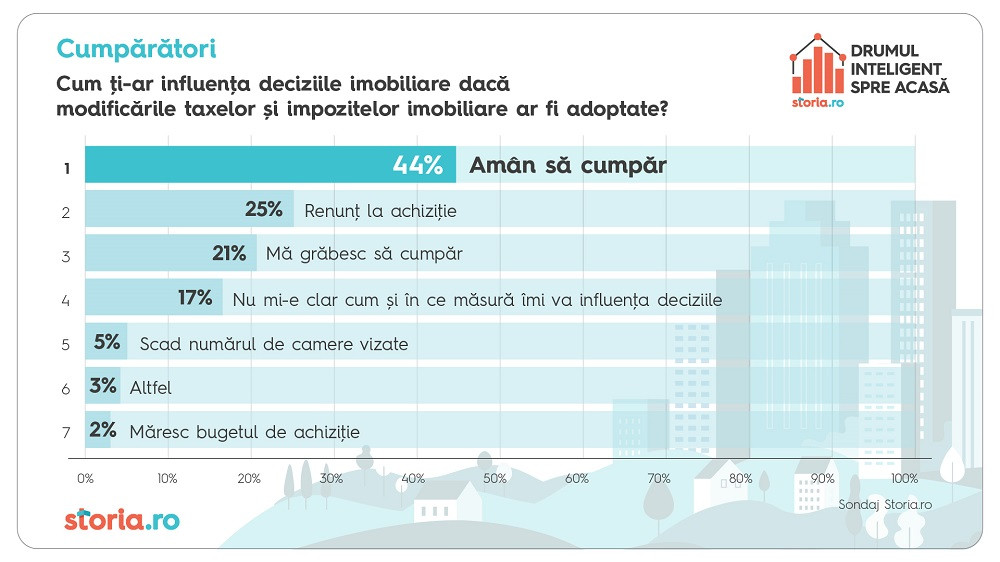 Întrebați în ce moduri le-ar afecta deciziile de achiziție din viitor, 44% dintre respondenții interesați în acest moment de cumpărarea unei locuințe au declarat că ar amâna să cumpere, 25% afirmă că ar renunța la achiziție, în timp ce 21% declară că s-ar grăbi să cumpere. Totuși, 17% dintre cumpărători declară că momentan nu le este clar cum și în ce măsură noile schimbări fiscale le-ar influența deciziile imobiliare.