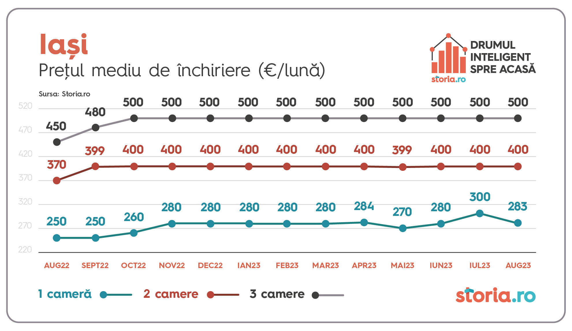 În Iași, în luna august a.c., o garsonieră se închiriază, în medie, cu 283 de euro, un apartament cu două camere cu 400 de euro, în timp ce unul cu trei camere se închiriază cu 500 de euro.