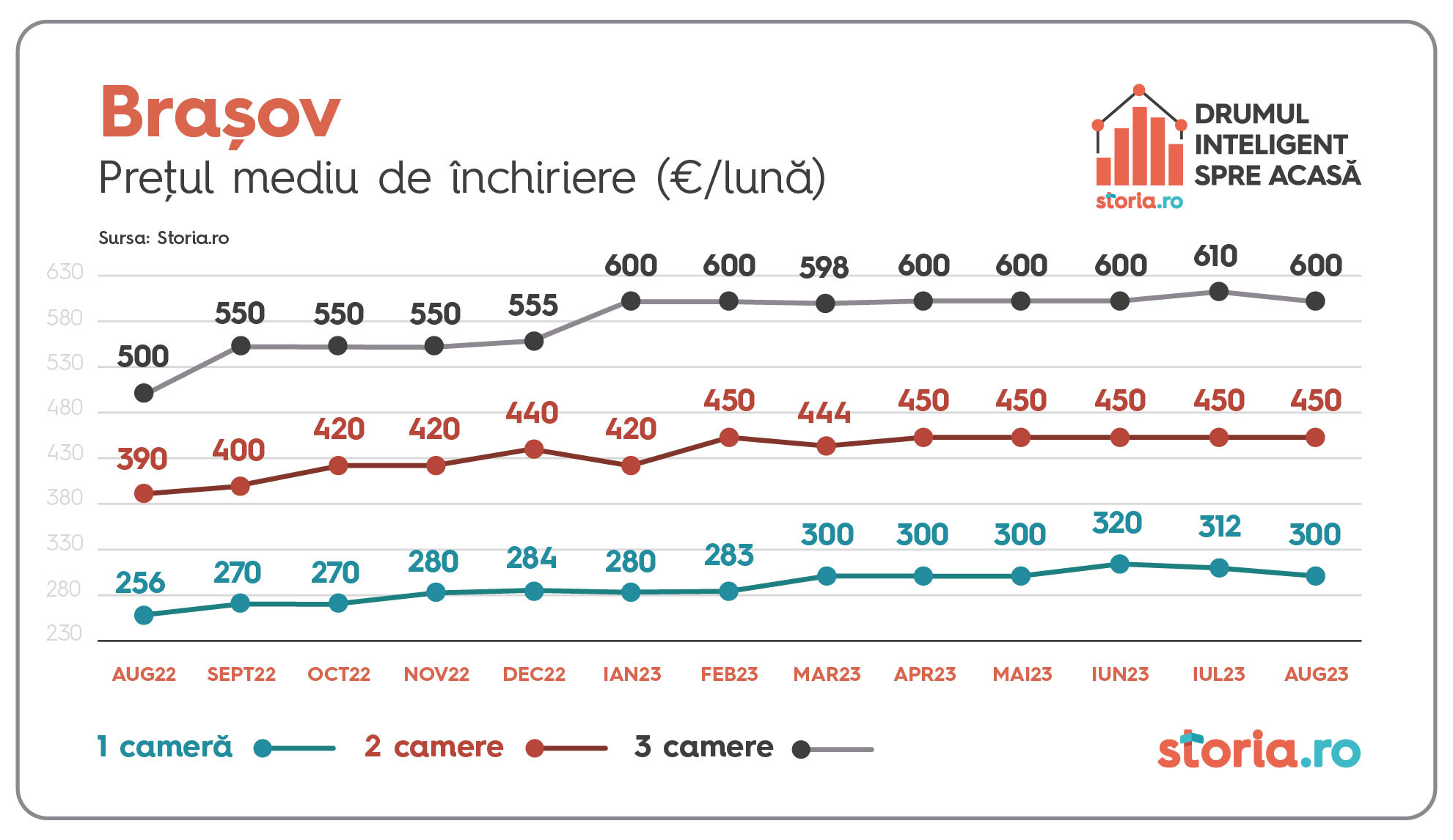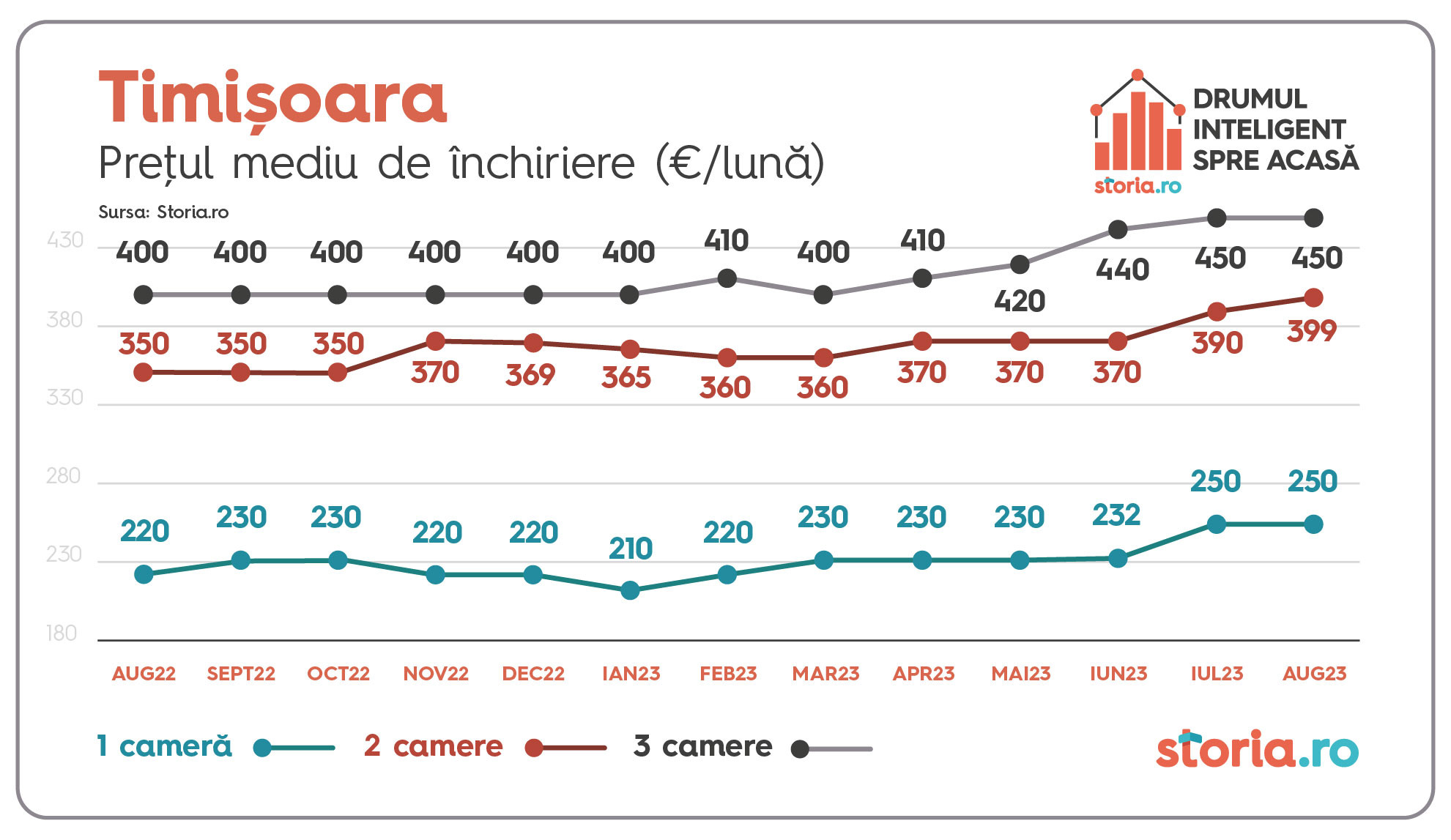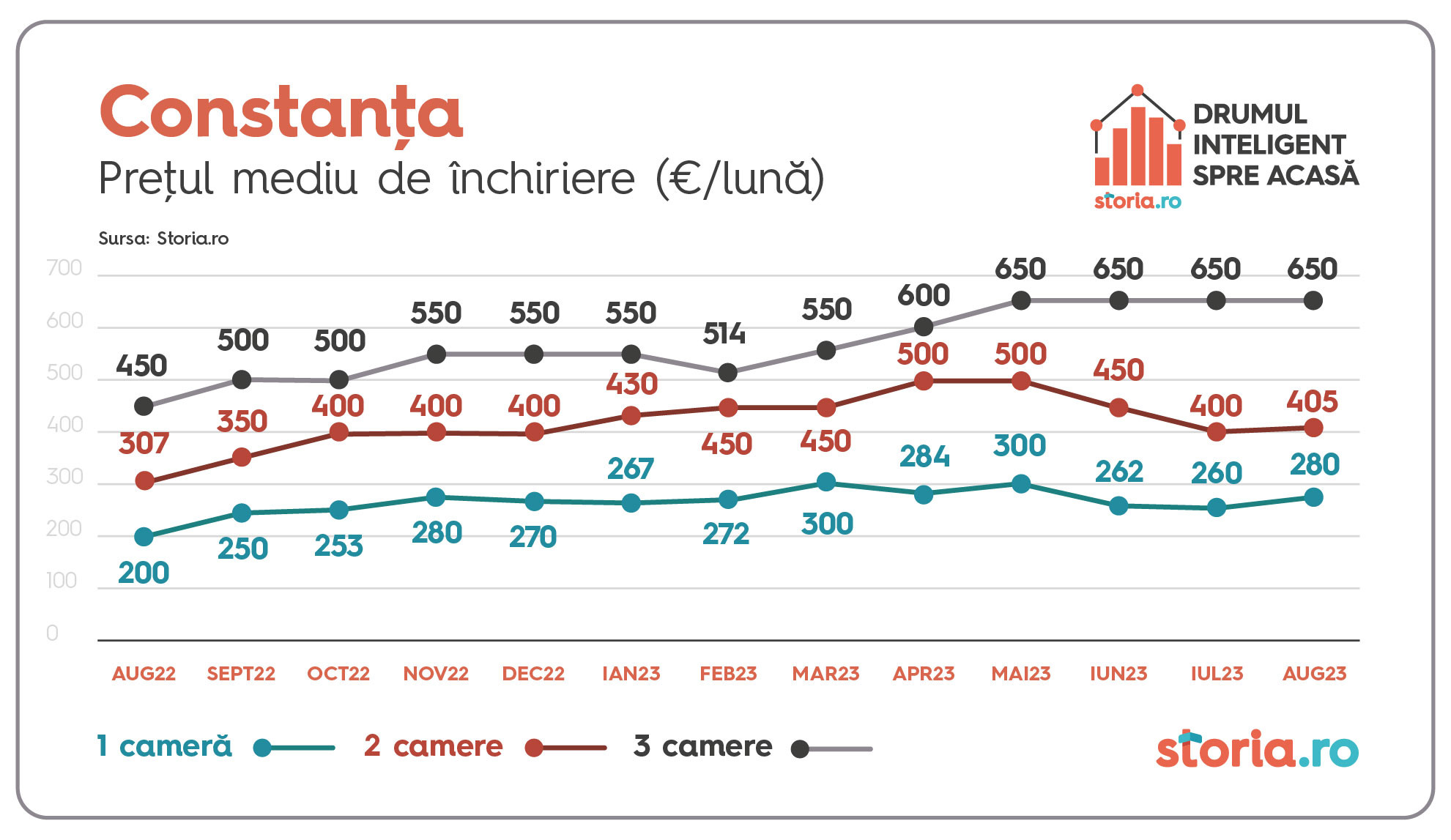 Dacă în luna iulie a.c. o garsonieră se închiria cu 312 de euro, în luna august a.c. prețul a scăzut cu 4% și a ajuns la 300 de euro. Prețul de închiriere pentru apartamentele cu două camere a rămas la fel, de 450 de euro, în timp ce prețul pentru închirierea apartamentelor cu trei camere a scăzut cu 2%, de la 610 euro la 600 de euro.