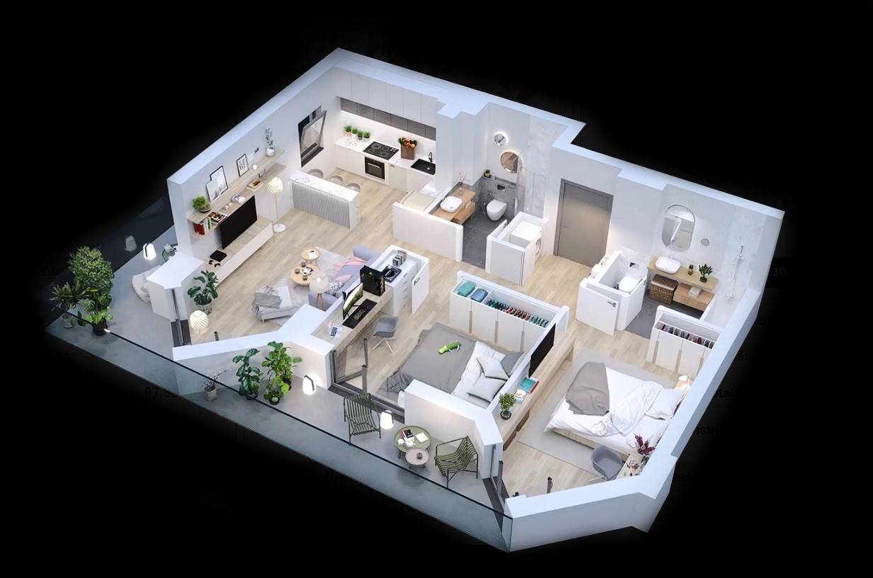 De la intrarea în apartament, în stânga aveți dormitorul matrimonial, care dispune de propria baie. În partea dreaptă, între holul de la intrare și bucătărie se mai regăsește o baie dotată cu buș.