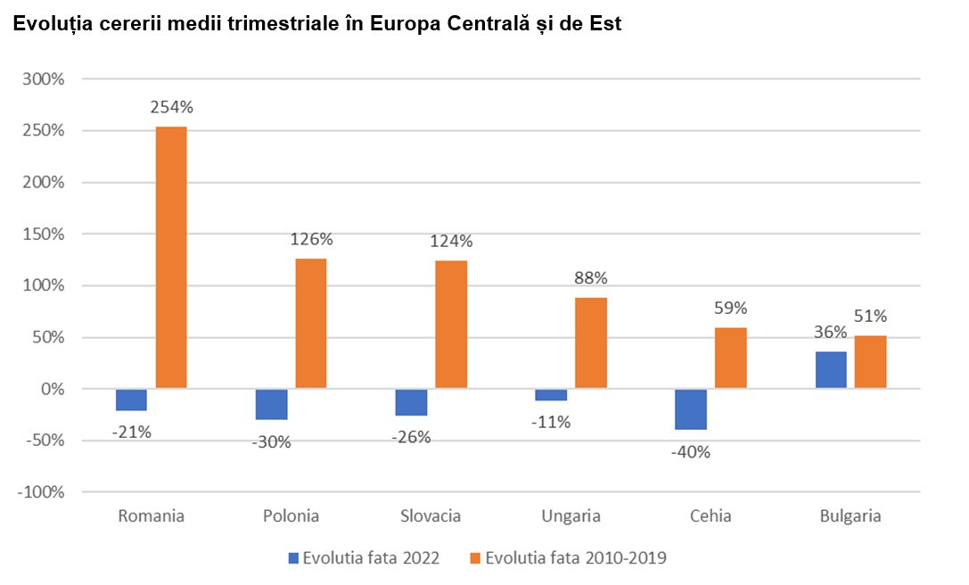 Raportat la evoluția cererii din Europa Centrală și de Est (Polonia, Cehia, România, Ungaria, Slovacia, Bulgaria), activitatea de închiriere din piața locală a avut cea mai mare creștere în perioada 2020-2023 comparativ cu nivelul pre-pandemie. Astfel, media trimestrială a cererii de spații industriale și de logistică la nivel național a crescut de 254% începând cu anul 2020, la 267.000 metri pătrați vs. 75.400 metri pătrați media trimestrială din perioada 2010-2019.