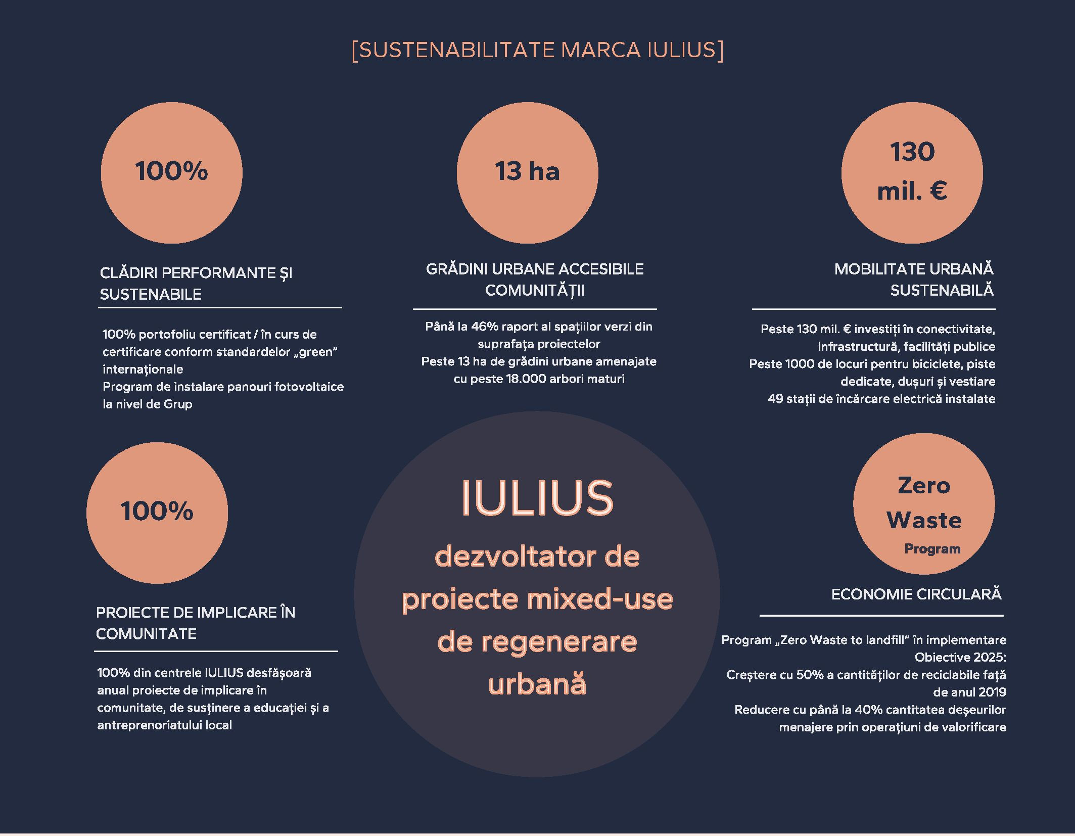 Grupul IULIUS accelerează politicile de sustenabilitate implementate cu scopul de a stimula dezvoltarea orașelor, iar cele mai importante componente sunt investițiile masive în spațiile verzi din proiectele pe care le are în Iași, Timișoara și Cluj-Napoca, dar și în infrastructură și conectivitate.