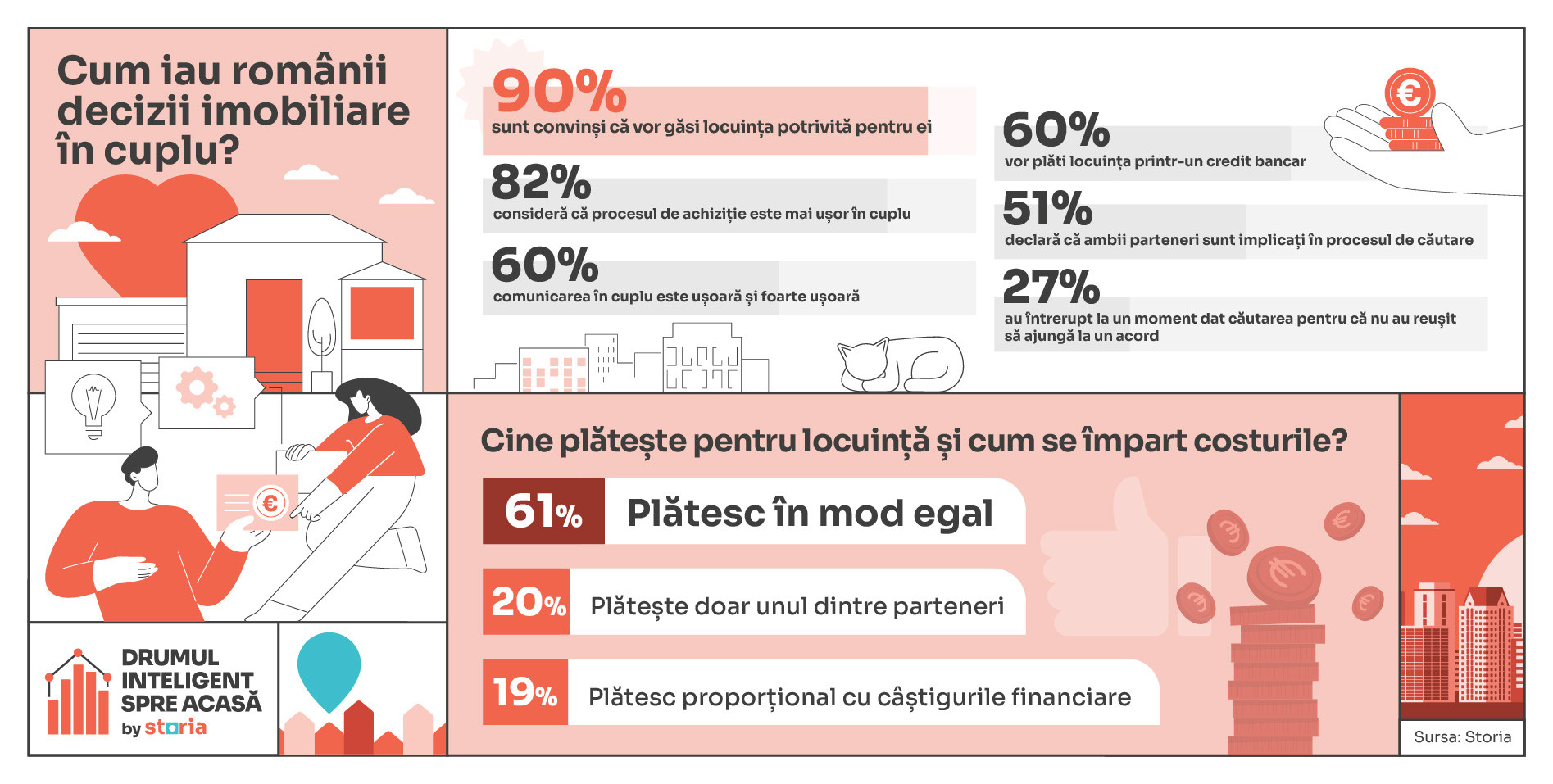 Aproximativ 82% dintre românii care sunt în căutarea unei locuințe sunt de părere că procesul de achiziție este mai ușor în cuplu, iar 90% sunt convinși că vor găsi proprietatea potrivită pentru ei, conform ultimului sondaj realizat în rândul utilizatorilor Storia și OLX Imobiliare.