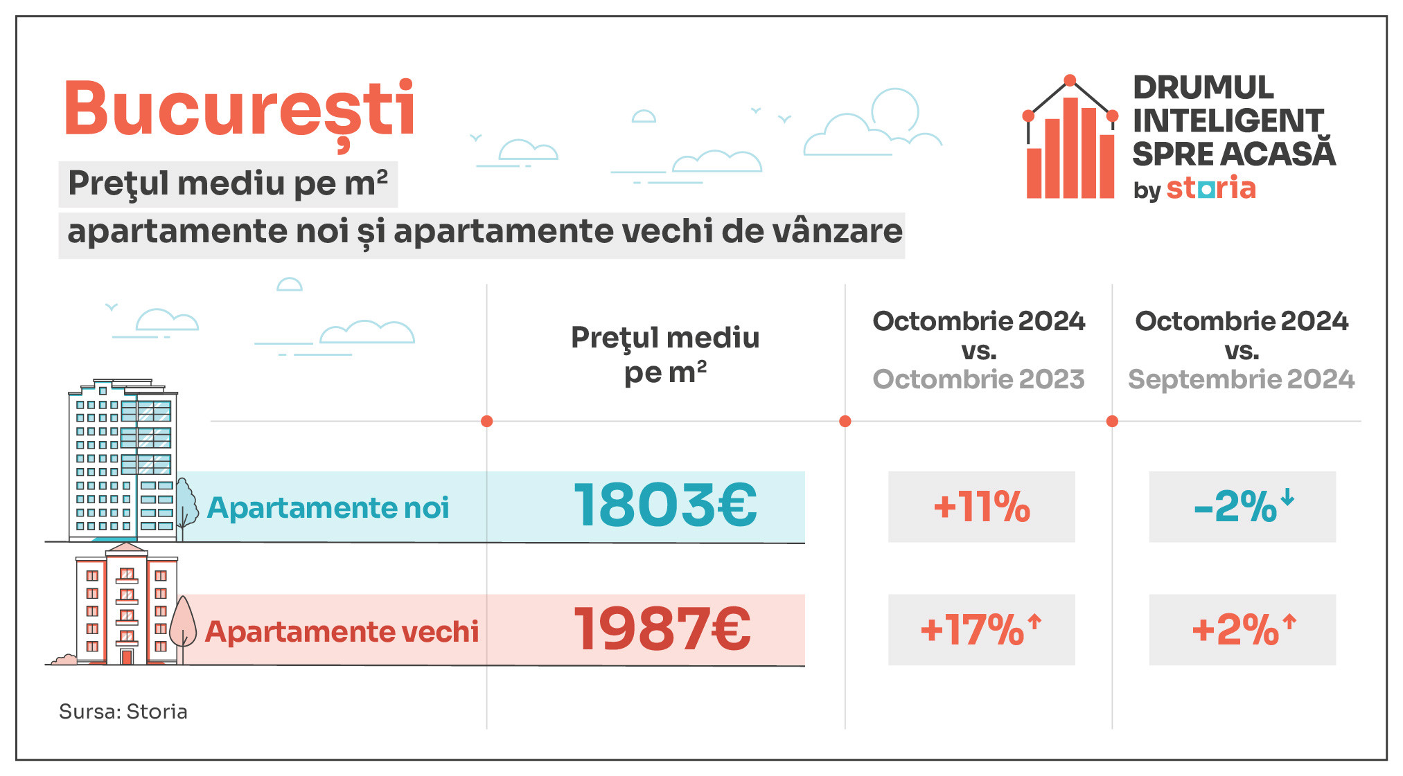 Conform celor mai recente date de pe Storia, platforma de imobiliare al OLX, dacă față de luna septembrie acestui an prețurile au arătat mai degrabă o stabilizare, prețurile medii ale apartamentelor de vânzare – vechi și noi – au înregistrat o creștere de 14% în octombrie comparativ cu aceeași lună a anului trecut,