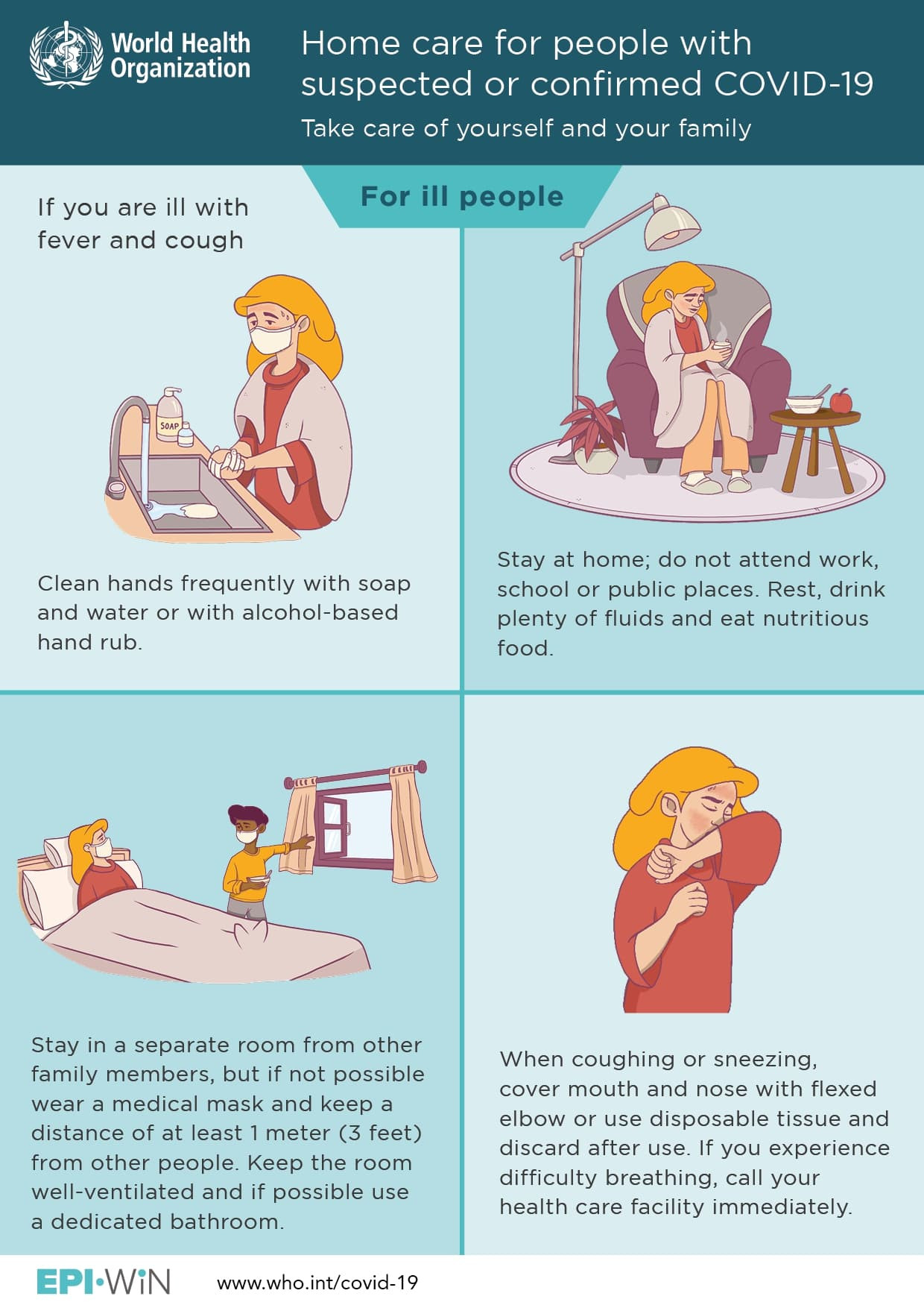 Organizația Mondială a Sănătății (OMS) prezintă câteva măsuri de siguranță pentru îngrijirea la domiciliu pentru persoanele suspecte sau confirmate cu COVID-19, pentru a-i proteja pe cei apropiați.