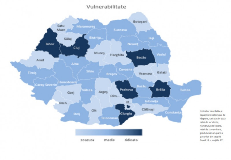 București și județele Bacău, Brăila, Bihor, Cluj, Giurgiu și Prahova au vulnerabilitate ridicată legată de epidemia de COVID-19, un indicator calculat în baza ratei de incidență, numărului de focare, ratei de transmitere, gradului de ocupare din secțiile destinate pacienților cu coronavirus și secțiile ATI, potrivit raportului săptămânal al Institutului Național de Sănătate Publică (INSP).