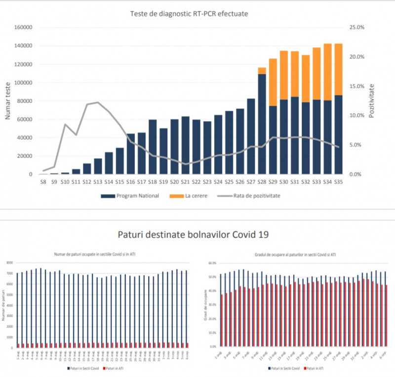 Potrivit raportului, rata de pozitivare a testelor RT-PCR este în jur de 5% la nivel național. De asemenea, se observă că mai mult de o treime din testele prelucrate în ultima săptămână au fost efectuate la cerere.
