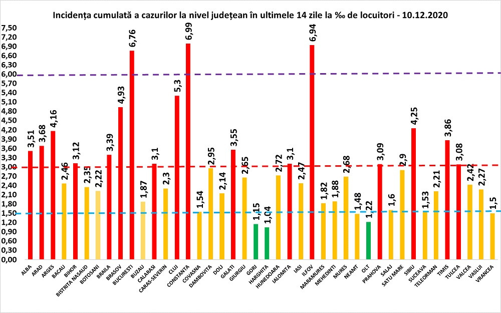 Coeficientul infectărilor cumulate la 14 zile, raportate la 1.000 de locuitori este calculat de către Direcțiile de Sănătate Publică, la nivelul Municipiului București și al județelor. Mai jos aveți graficul realizat în baza raportărilor primite de CNCCI de la Direcțiile de Sănătate Publică: