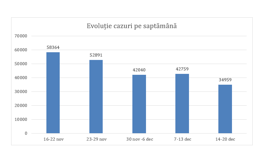 În urma analizei evoluției infectărilor cu noul tip de coronavirus pe teritoriul României în ultimele două luni se desprind câteva concluzii. În acest moment evoluția răspândirii virusului SARS-COV-2 este pe o pantă vizibil descendentă. Dacă în urmă cu o lună erau înregistrate aproximativ 60 de mii de persoane nou infectate într-o săptămână, la nivel național, săptămâna trecută au fost înregistrate sub 35 de mii de cazuri.
