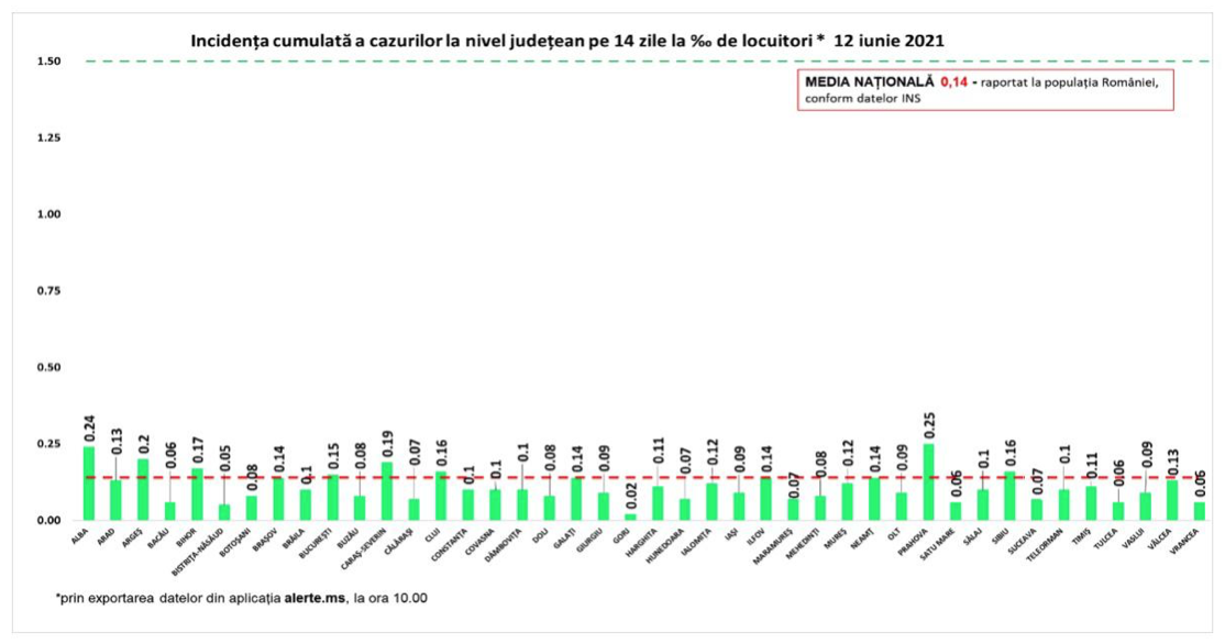 127 cazuri noi de persoane infectate cu SARS – CoV – 2 (COVID – 19), acestea fiind cazuri care nu au mai avut anterior un test pozitiv. Până astăzi, 12 iunie, pe teritoriul României, au fost confirmate 1.079.657 de cazuri de persoane infectate cu noul coronavirus (COVID – 19). 1.044.000 de pacienți au fost declarați vindecați.