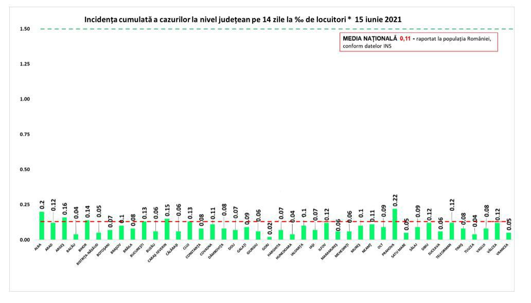 Până astăzi, 15 iunie, pe teritoriul României, au fost confirmate 1.079.879 de cazuri de persoane infectate cu noul coronavirus (COVID – 19). 1.044.563 de pacienți au fost declarați vindecați. În urma testelor efectuate la nivel național, față de ultima raportare, au fost înregistrate 103 cazuri noi de persoane infectate cu SARS – CoV – 2 (COVID – 19), acestea fiind cazuri care nu au mai avut anterior un test pozitiv.