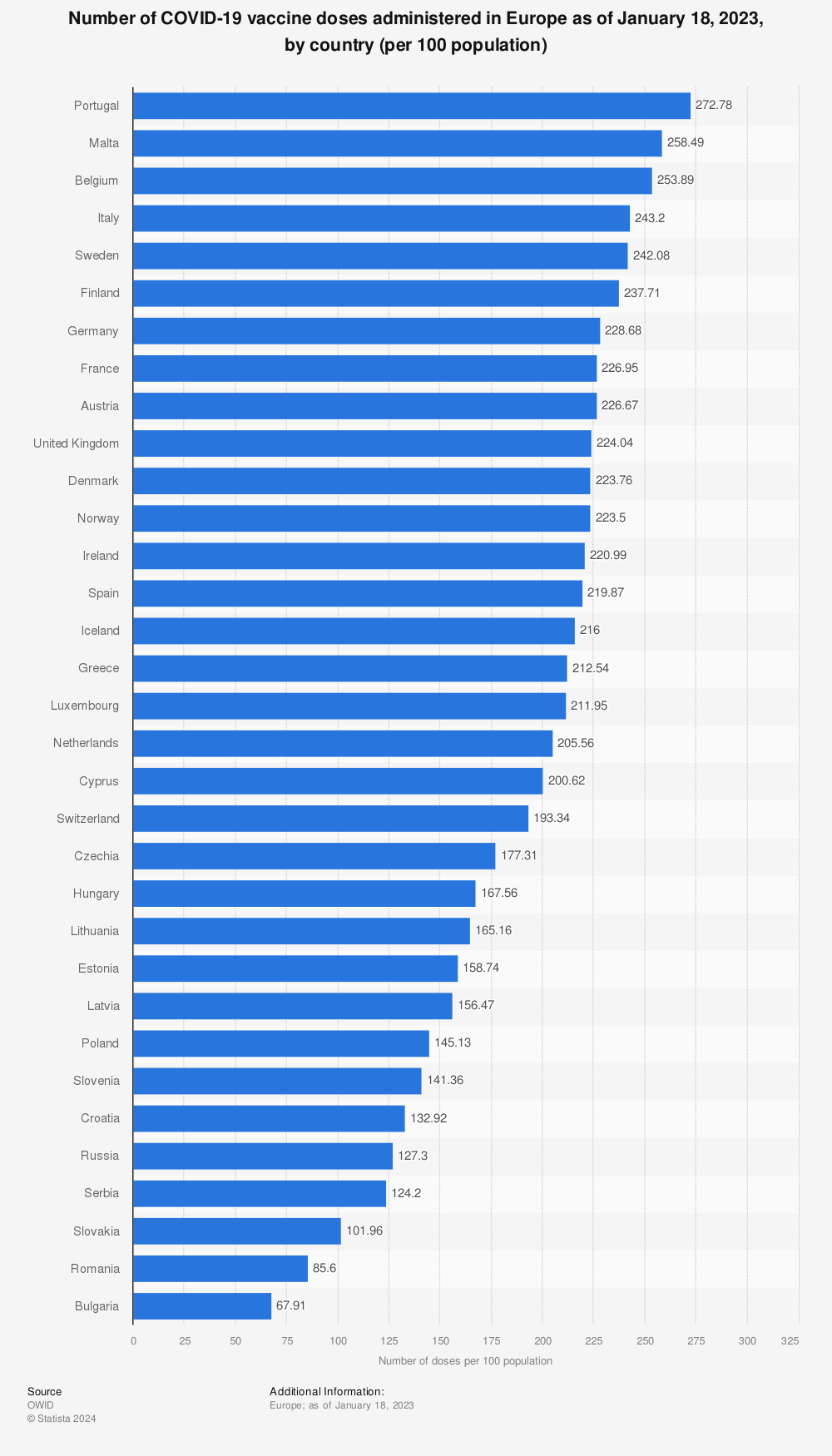 Cu toate acestea, România se află pe antepenultimul loc în ceea ce privește rata de vaccinare în rândul populației. Până la data de 1 iulie 2021, România avea o rată de vaccinare de 47.570 de doze injectate la 100 de persoane din țară, față de 151.910 doze adiministrate de Malta, o țară care conduce clasamentul țărilor în ceea ce privește rata de vaccinare a poluației, potrivit Statista.