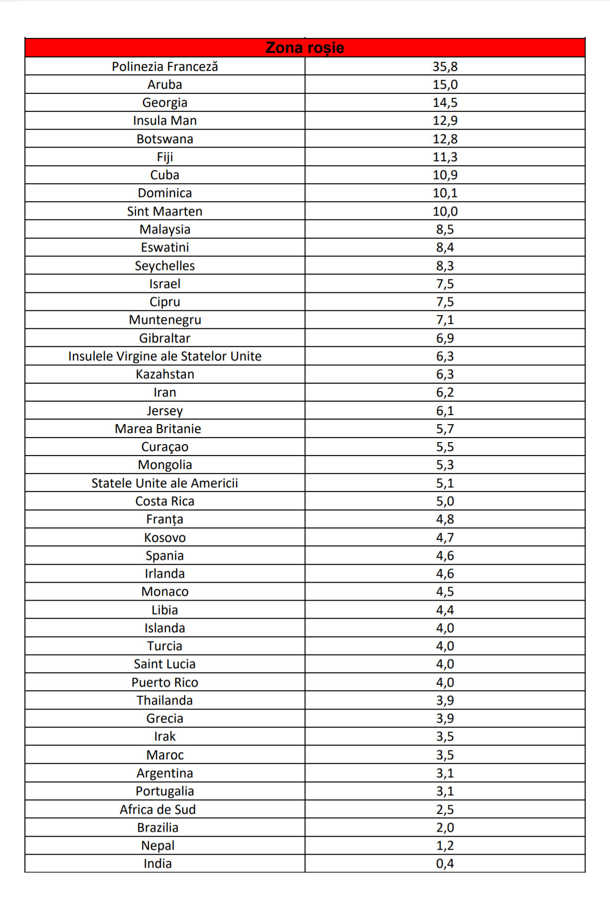 Pe lista roșie nu lipsesc Turcia, Grecia sau Spania, unele dintre cele mai vizate destinații ale românilor. SUA, Israel, Cipru, Franța, Portugalia și Marea Britanie sunt și ele pe lista zonelor cu risc ridicat de infectare cu COVID-19.