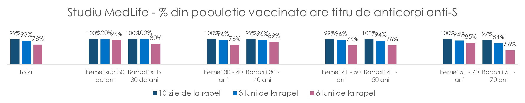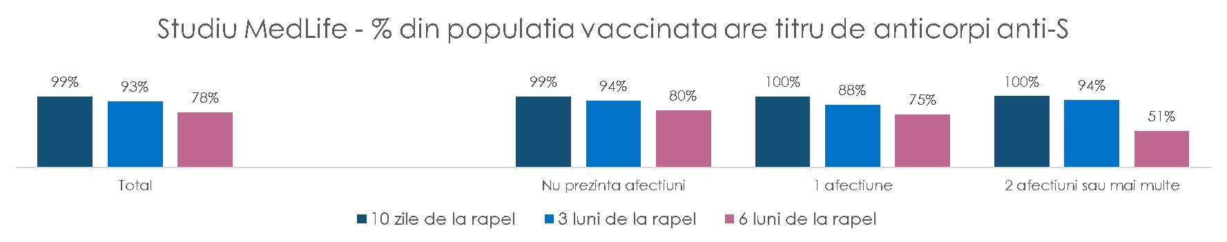 Studiul MedLife arată că deși titrul de anticorpi scade în intervalul de 6 luni de la administrare rapelului (media de scădere a anticorpilor anti-S fiind de 78% pe eșantionul studiat - de la 1050 AU/ml până la 233 AU/ml) 3 din 4 persoane vaccinate au valori ale titrului de anticorpi anti-S mai mari de 80 AU/ml chiar și la 6 luni post-vaccin, ceea ce sugerează o anumită protecție împotriva formelor grave de COVID-19 în cazul expunerii la virusul SARS-CoV-2.