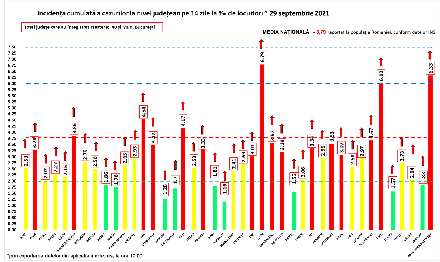Coeficientul infectărilor cumulate la 14 zile, raportate la 1.000 de locuitori este calculat de către Direcțiile de Sănătate Publică, la nivelul Municipiului București și al județelor. Mai jos aveți graficul realizat în baza raportărilor primite de CNCCI de la Direcțiile de Sănătate Publică: