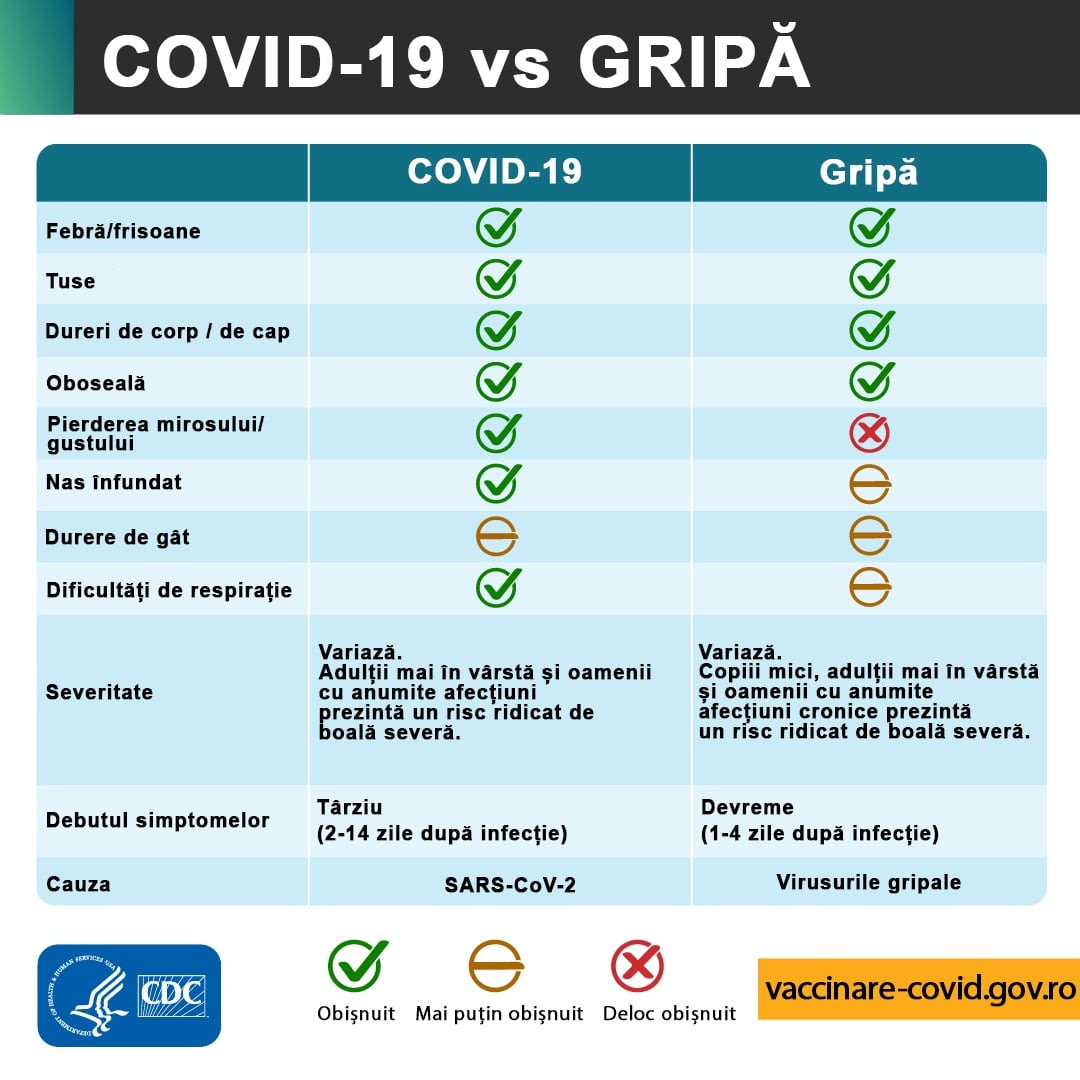 Deși febra, tusea și durerile corporale sunt simptome comune, dificultățile de respirație și pierderea gustului sau mirosului sunt mai frecvente în cazul COVID-19 decât în cazul gripei.