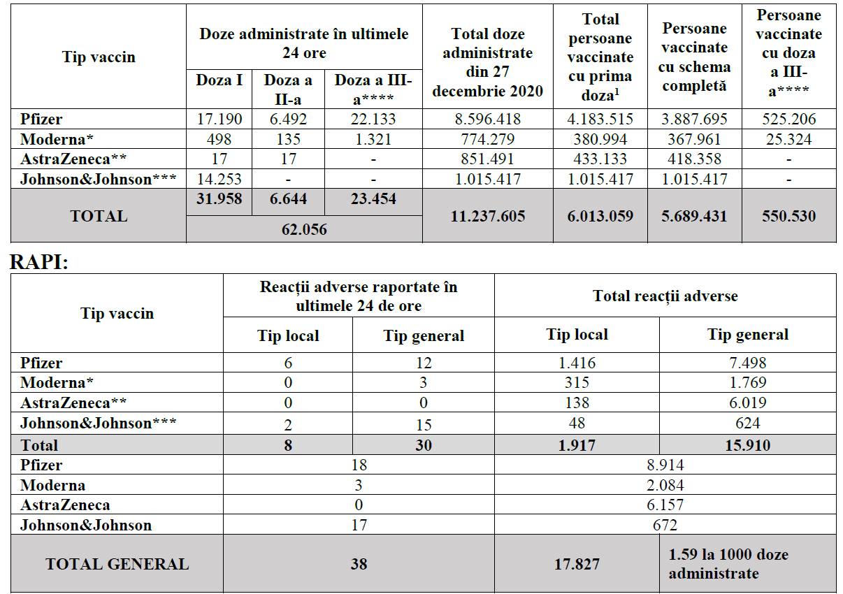 Din cauza faptului că descărcarea datelor din platforma RENV pentru ultimele 24 ore, respectiv pentru întreaga perioadă a campaniei de vaccinare, nu se poate realiza simultan și instantaneu, apar diferențe privind numărul de doze administrate în ultimele 24h. În intervalul de descărcare a datelor sunt înregistrate dozele administrate în această perioadă scurtă de timp.