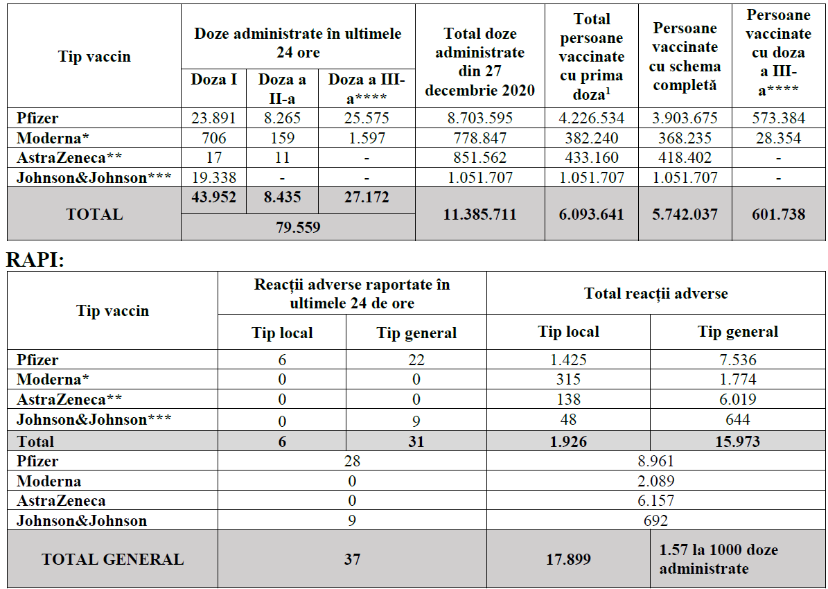 Din cauza faptului că descărcarea datelor din platforma RENV pentru ultimele 24 ore, respectiv pentru întreaga perioadă a campaniei de vaccinare, nu se poate realiza simultan și instantaneu, apar diferențe privind numărul de doze administrate în ultimele 24h. În intervalul de descărcare a datelor sunt înregistrate dozele administrate în această perioadă scurtă de timp.