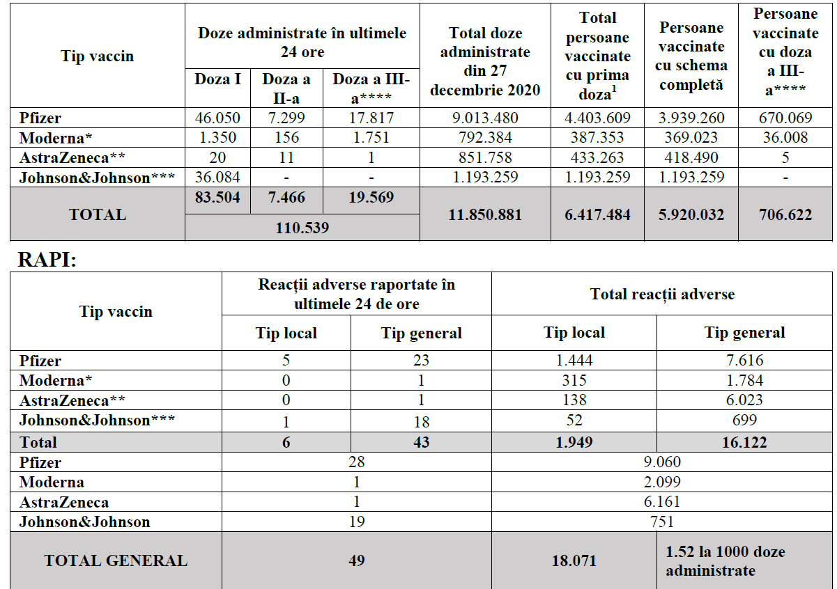 Potrivit datelor puse la dispoziția Comitetului Național de Coordonare a Activităților privind Vaccinarea împotriva COVID-19 (CNCAV) de către Institutul Național de Sănătate Publică (INSPCNSCBT), prin aplicația Registrul Electronic Național al Vaccinărilor (RENV), care ține evidența vaccinărilor, situația din ziua de 24 octombrie a.c., ora 17.00, este următoarea: