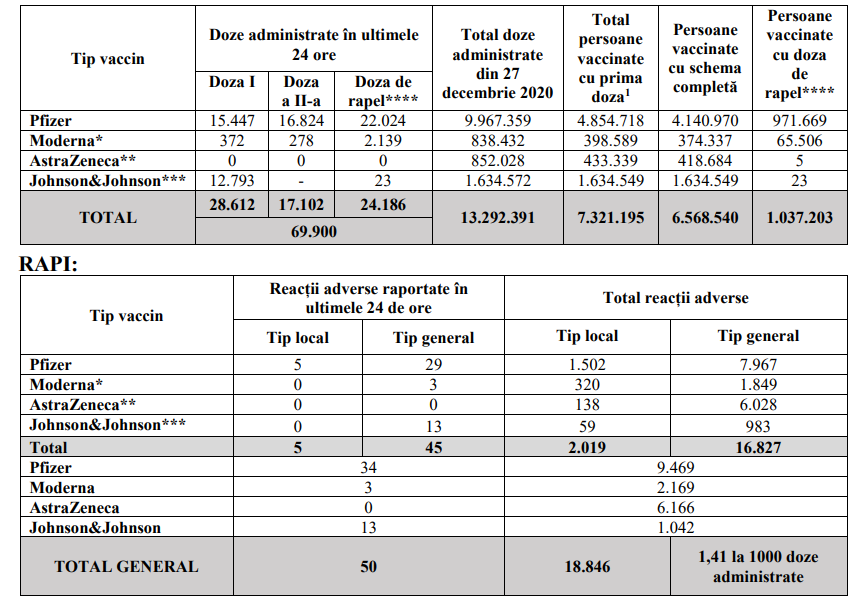 Potrivit datelor puse la dispoziția Comitetului Național de Coordonare a Activităților privind Vaccinarea împotriva COVID-19 (CNCAV) de către Institutul Național de Sănătate Publică, prin aplicația Registrul Electronic Național al Vaccinărilor (RENV), care ține evidența vaccinărilor, situația din ziua de 8 noiembrie a.c., ora 17.00, este următoarea:
