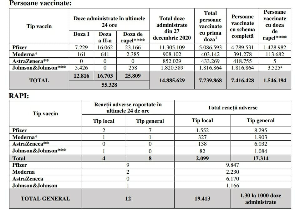 Potrivit datelor puse la dispoziția Comitetului Național de Coordonare a Activităților privind Vaccinarea împotriva COVID-19 (CNCAV) de către Institutul Național de Sănătate Publică (INSP-CNSCBT), prin aplicația Registrul Electronic Național al Vaccinărilor (RENV), care ține evidența vaccinărilor, situația din ziua de 29 noiembrie a.c., ora 17:00, este următoarea: