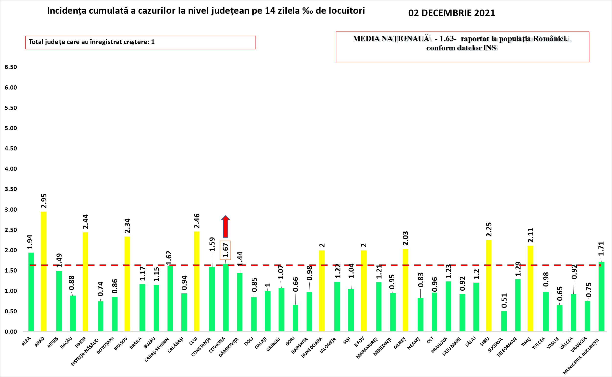 Până astăzi, 2 decembrie, pe teritoriul României au fost înregistrate 1.781.957 de cazuri de infectare cu noul coronavirus (COVID – 19), dintre care 10.366 sunt ale unor pacienți reinfectați, testați pozitiv la o perioadă mai mare de 180 de zile după prima infectare. 1.691.356 de pacienți au fost declarați vindecați. În ultimele 24 de ore au fost înregistrate 1.149 de cazuri noi de persoane infectate cu SARS – CoV – 2 (COVID – 19), dintre care 18 sunt ale unor pacienți reinfectați, testați pozitiv la o perioadă mai mare de 180 de zile după prima infectare.