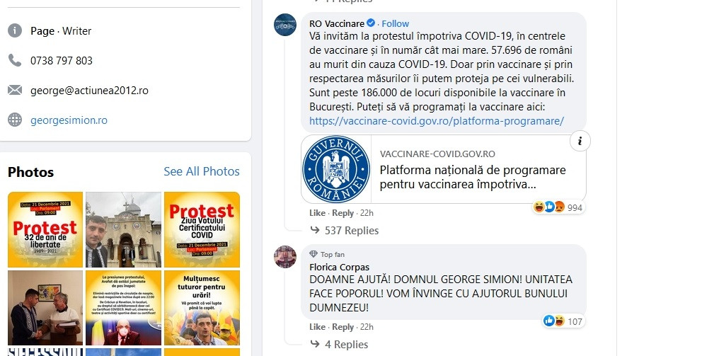 George Simion, liderul partidului AUR, a îndemnat românii pe Facebook să iasă la un protest pe data de 21 decembrie, în fața Parlamentului. La postare a răspuns și RO Vaccinare, pagina oficială a campaniei de vaccinare anti-coronavirus din România, care i-a îndemnat pe români să „vină la protest în centrele de vaccinare, în număr cât mai mare”.