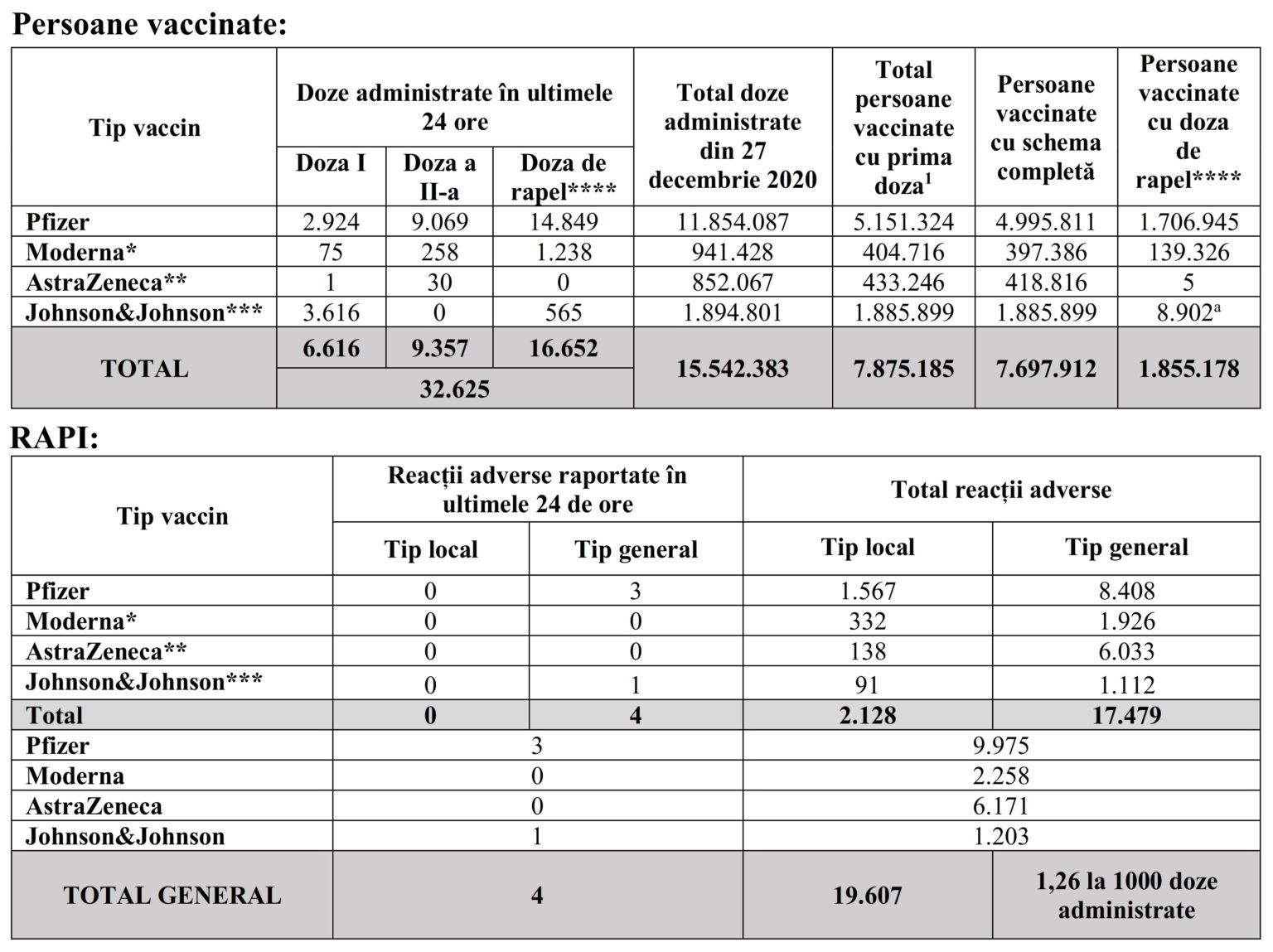 Potrivit datelor puse la dispoziția Comitetului Național de Coordonare a Activităților privind Vaccinarea împotriva COVID-19 (CNCAV) de către Institutul Național de Sănătate Publică (INSP-CNSCBT), prin aplicația Registrul Electronic Național al Vaccinărilor (RENV), care ține evidența vaccinărilor, situația din ziua de 16 decembrie, ora 17:00, este următoarea: