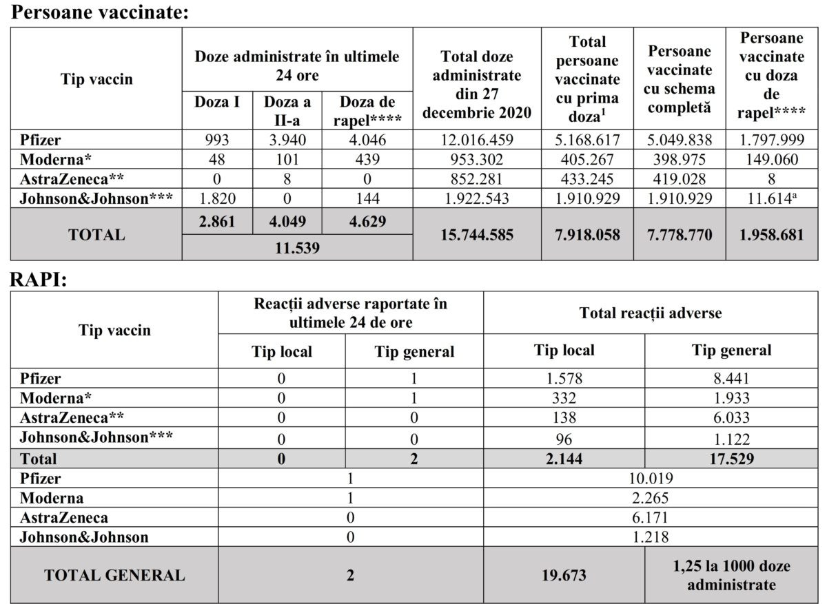 Potrivit datelor puse la dispoziția Comitetului Național de Coordonare a Activităților privind Vaccinarea împotriva COVID-19 (CNCAV) de către Institutul Național de Sănătate Publică (INSP-CNSCBT), prin aplicația Registrul Electronic Național al Vaccinărilor (RENV), care ține evidența vaccinărilor, situația din ziua de 24 decembrie a.c., ora 17.00, este următoarea: