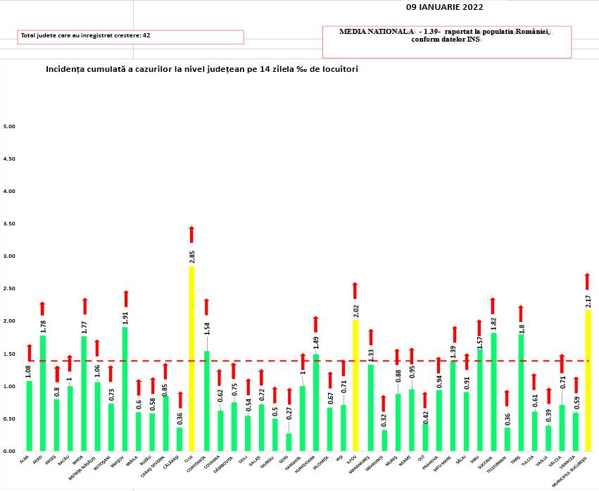 Coeficientul infectărilor cumulate la 14 zile, raportate la 1.000 de locuitori este calculat de către Direcțiile de Sănătate Publică, la nivelul Municipiului București și al județelor.