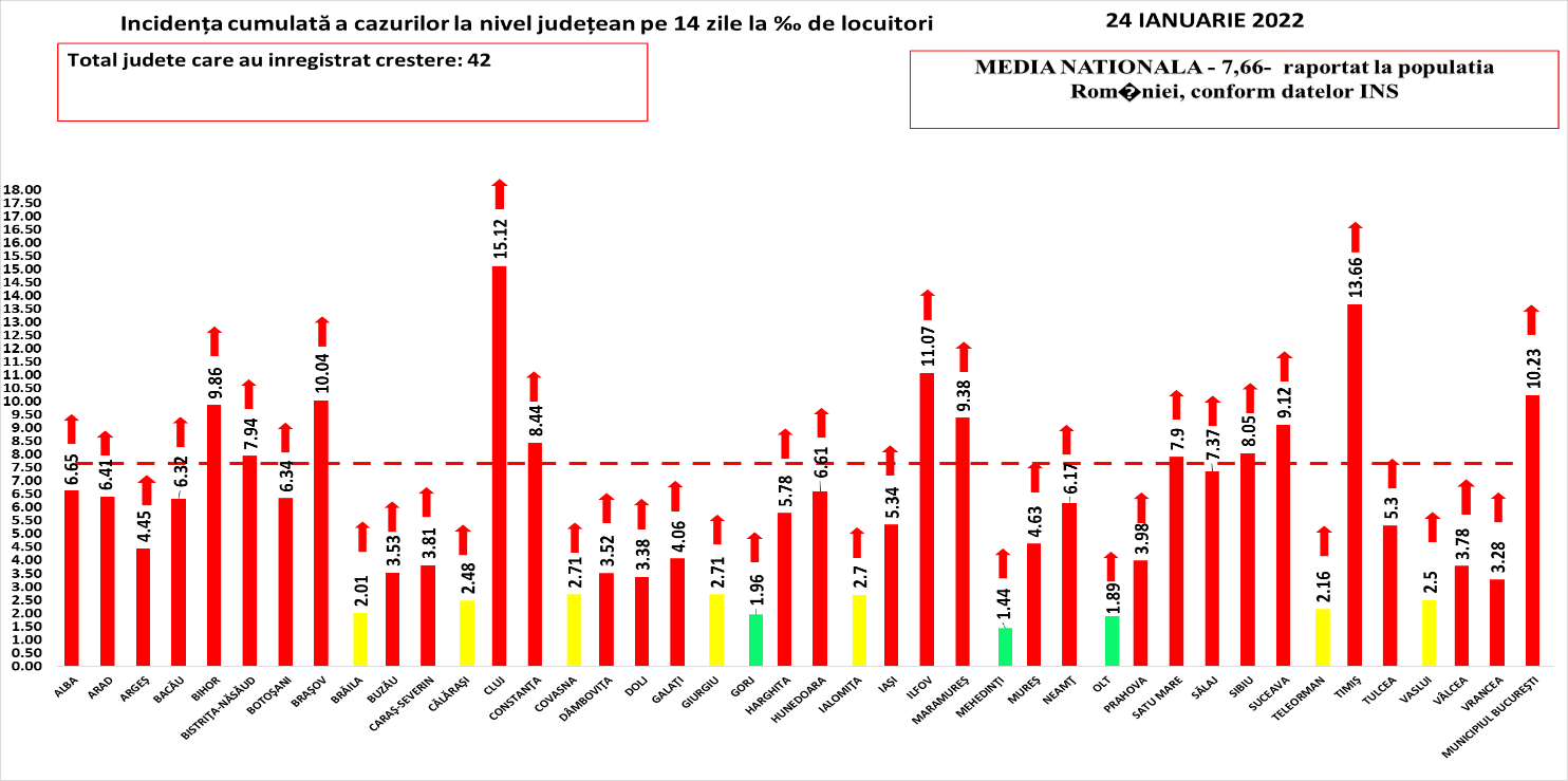 Coeficientul infectărilor cumulate la 14 zile, raportate la 1.000 de locuitori este calculat de către Direcțiile de Sănătate Publică, la nivelul Municipiului București și al județelor. Mai jos aveți graficul realizat în baza raportărilor primite de CNCCI de la Direcțiile de Sănătate Publică: