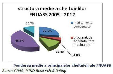 Cele mai mari cheltuieli ale FNUASS, ca structura medie in intervalul 2005-2012, sunt cele cu spitalele, care absorb 45,5% din total, urmate de cele cu medicamentele compensate cu si fara contributie persoanala, incluzandu-le pe cele din programele nationale (27,5% in medie), cu asistenta medicala primara/medicii de familie (12,4%) si cu programele nationale (fara medicamente) – 4%. Restul de 10,7% reprezinta alte cheltuieli (de exemplu, asistenta sociala pentru mamele in concediu de maternitate).