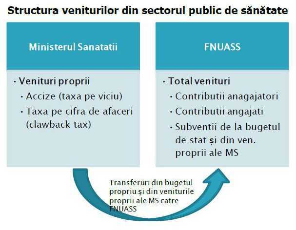In Romania, din totalul resurselor alocate sanatatii, aproape 80% sunt publice, iar restul private (plati directe sau tarife/servicii). Din resursele publice, 85% sunt administrate Fondul National Unic de Asigurari Sociale de Sanatate (FNUASS), la care contribuie angajatori si angajati, pensionari si persoane fizice autorizate. In 2011, din punct de vedere nominal, veniturile Fondului s-au ridicat la 17,8 miliarde lei.