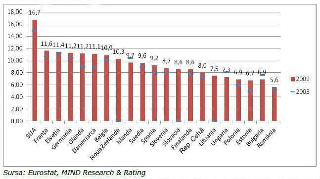 In comparatie cu celelalte state ale UE, Romania este statul cu cele mai mici cheltuieli de sanatate din PIB, inregistrand o valoare de 5,6 % in anul 2009 fata de media comunitatii de 9,9%. Anul trecut, cheltuielile publice cu sanatatea in Romania au atins 3,7% din PIB, in scadere fata de anul 2010, potrivit raportului.