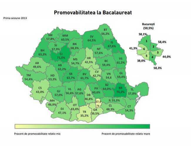 Datele finale, inainte de contestatii, arata o usoara crestere a procentului de promovare, comparativ cu ultimii doi ani, dar mai mica decat in 2010 (2013 - 55,4%, 2012 - 44,4%, 2011 - 45, 7%, 2010 - 69,3%) cu diferente sesizabile, insa, intre promotiile curenta si anterioare, dar si intre mediul urban si mediul rural. In mediul rural rata de promovare a fost mai mica decat in cel urban: promotia curenta urban - 65,4% si rural - 46,1%; promotiile anterioare urban - 31% si rural - 29,1%.