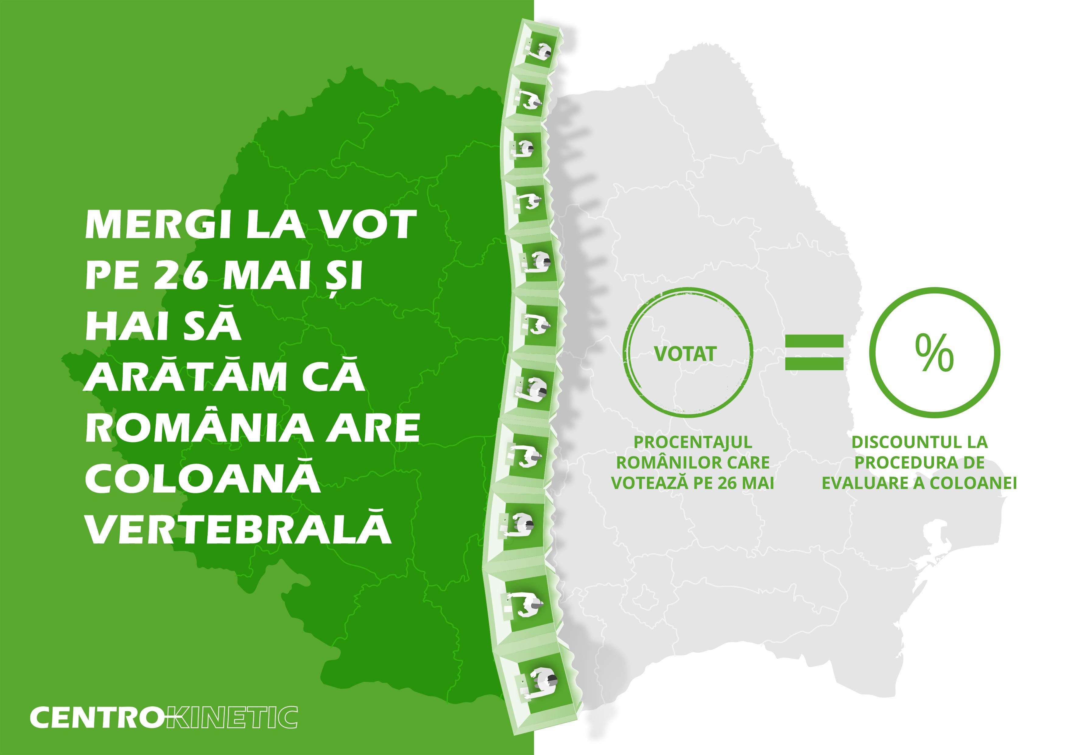 Pentru a incuraja prezenta la vot in randul romanilor, Clinica de recuperare Centrokinetic a lansat campania "Romania are nevoie de coloana vertebrala" si anunta ca va oferi, pe tot parcursul lunii iunie, un discount egal cu prezenta la vot a romanilor la alegerile europarlamentare.