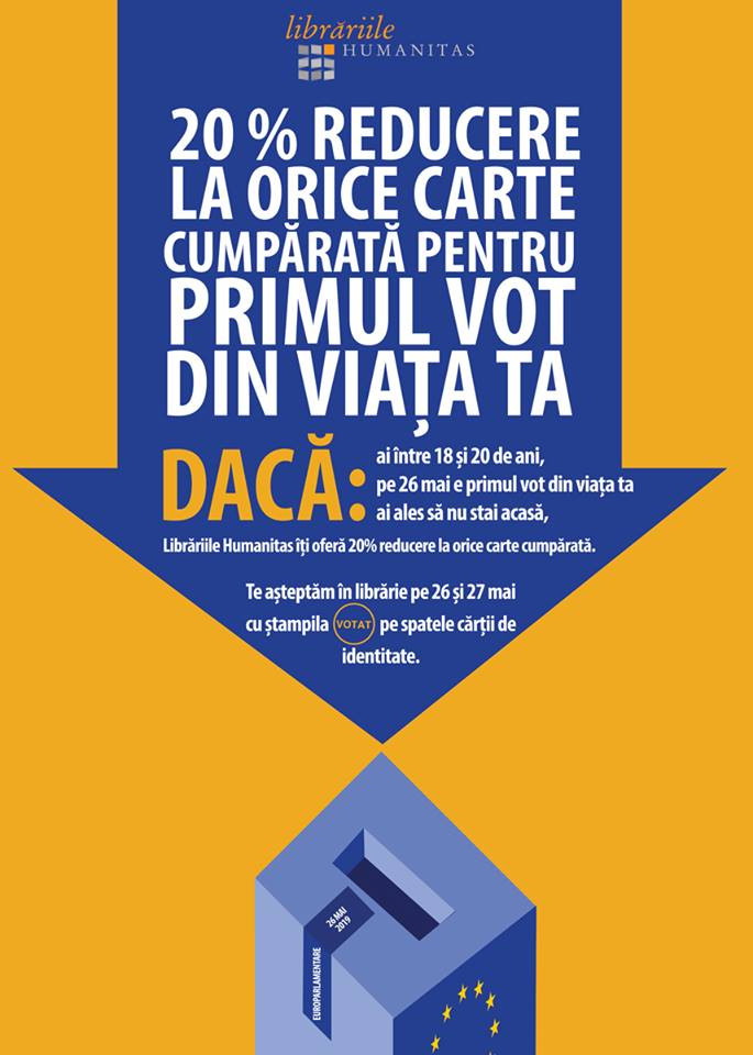 "In Librariile Humanitas - ai 20% reducere la orice carte cumparata cu ocazia primul vot din viata ta! Daca ai intre 18 si 20 de ani, pe 26 mai e primul vot din viata ta si ai ales sa nu stai acasa, Librariile Humanitas iti ofera 20% reducere la orice carte cumparata. Te asteptam in orice librarie Humanitas pe 26 si 27 mai cu stampila VOTAT pe spatele cartii de identitate", au transmis cei de la Humanitas, pe Facebook.
