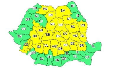 Prima avertizare, valabila de luni, la ora 13.00, pana la ora 18.00, vizeaza zonele montane, cea mai mare parte a Transilvaniei, a Moldovei, precum si nordul Olteniei si jumatatea de nord a Munteniei.