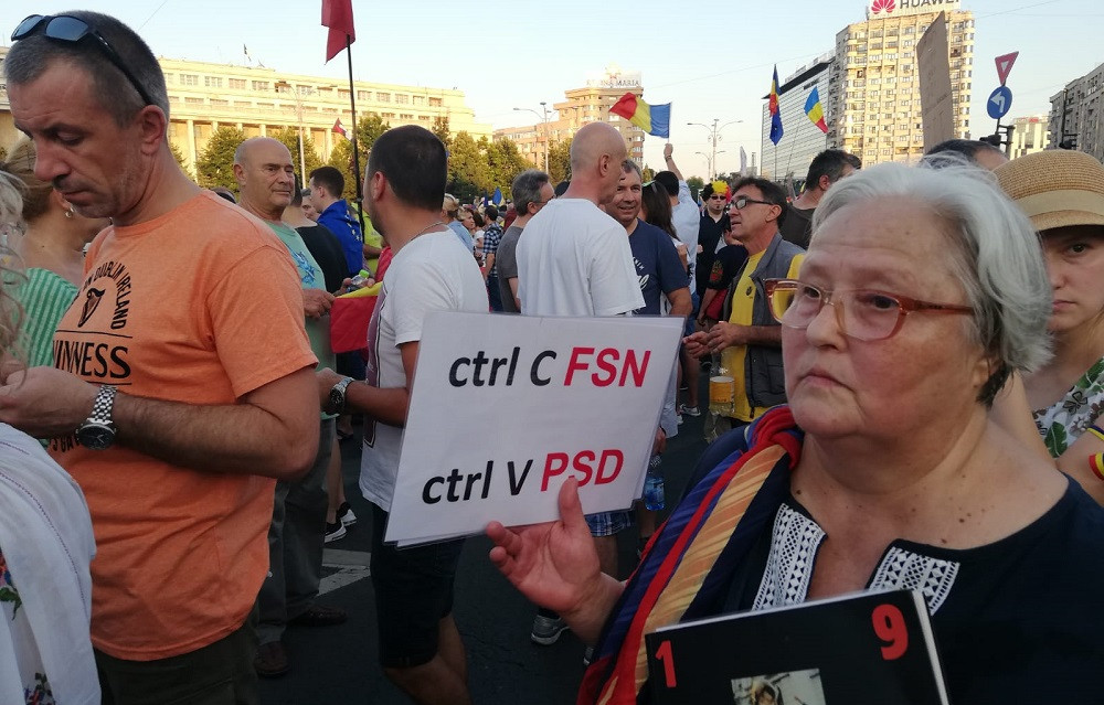 "Demisia Teodorovici, Daea", "Fara penali in functii publice", "Coruptia ucide", "Romania nu e a voastra! Plecati la capsuni sau la puscarie" - sunt mesajele afisate in piata.