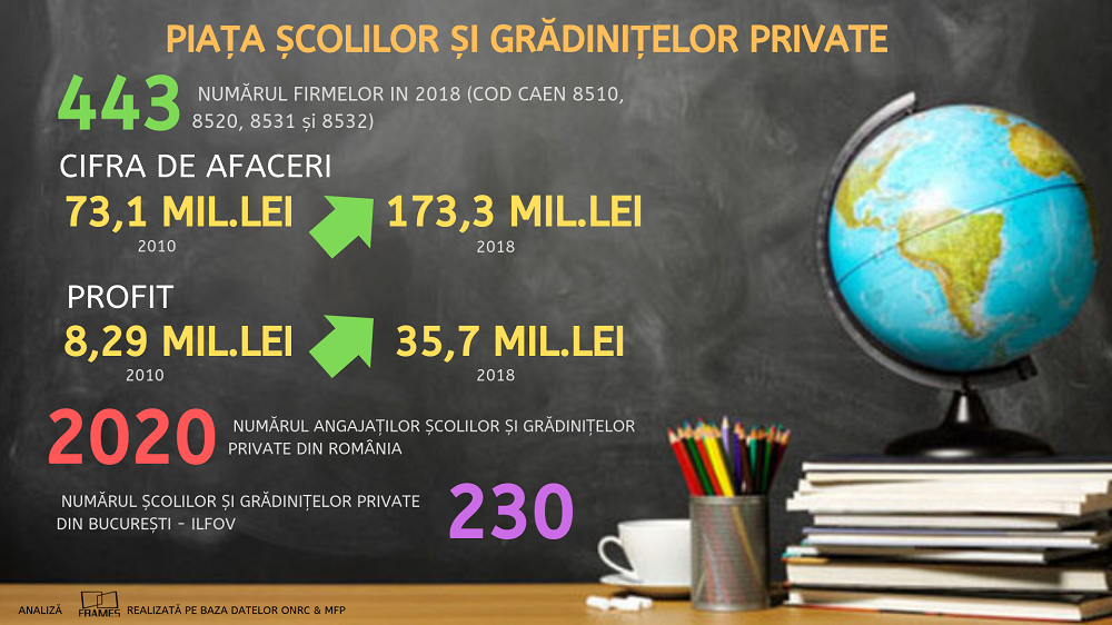Analiza Frames a fost realizata pe baza datelor de la Registrul Comertului si Ministerul Finantelor, comunicate de firmele care au codurile CAEN 8510, 8520, 8531 si 8532, in perioada 2010-2018. Datele statistice nu includ rezultatele firmelor care activeaza in invatamantul universitar.