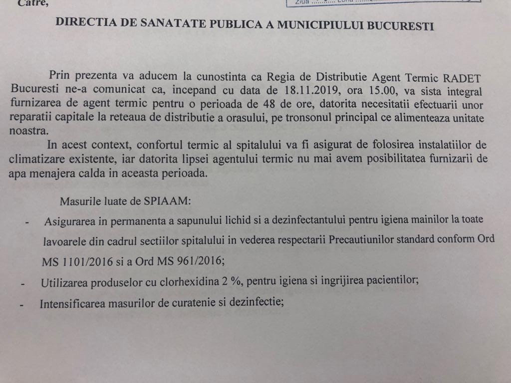 Reprezentantii RADET spun ca este vorba despre continuarea lucrarilor de saptamana trecuta, la magistrala de la CET Progresu, si nu mai pot amana: "Dureaza 48 de ore. Noi lucram din primavara in tot orasul, acum s-a ajuns si aici. Spitalul are obligatia potrivit legii sa asigure o sursa alternativa de incalzire si apa calda. Din pacate aceasta nu mai este functionala, de asta s-a ajuns aici", au explicat luni reprezentanti ai RADET pentru HotNews.ro.