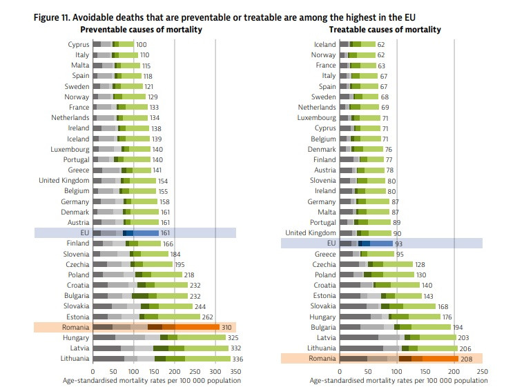 Romania are cea mai ridicata rata a mortalitatii din cauze tratabile dintre tarile UE, arata raportul citat. In ceea ce priveste mortalitatea din cauze prevenibile, Romania ocupa locul al patrulea in UE la cel mai mare numar de cazuri, dupa Lituania, Letonia si Ungaria (foto jos).