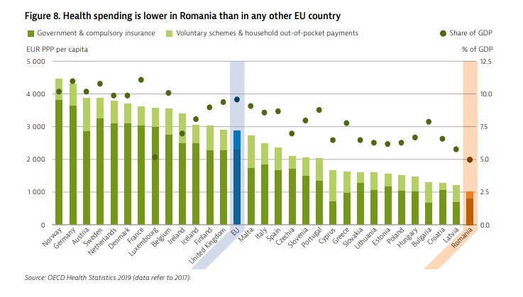 ”Cheltuielile in ceea ce priveste sanatatea au atins un nivel minim istoric si sunt mult sub nivelul celor din oricare alta tara din UE, atat pe cap de locuitor, cat si ca procent din PIB (5,2 % din PIB in 2017 fata de media UE de 9,8 %). Subfinantarea sistemului submineaza capacitatea Romaniei de a raspunde nevoilor actuale ale populatiei. Va fi din ce in ce mai dificil sa se raspunda acestor nevoi pe masura ce populatia imbatraneste, iar baza de resurse se diminueaza”, consemneaza Raportul privind starea sanatatii in UE.