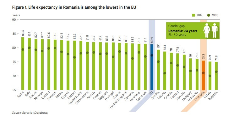 Speranta de viata in Romania este printre cele mai scazute din UE, arata raportul anual "Starea Sanatatii in Uniunea Europeana", publicat astazi de Comisia Europeana. In timp ce media UE este de 80,9 ani, in Romania, media sperantei de viata este de 75,3 ani. Chiar daca a crescut comparativ cu anul 2000, cand speranta de viata in Romania era de 71,2%, ea ramane una dintre cele mai scazute.