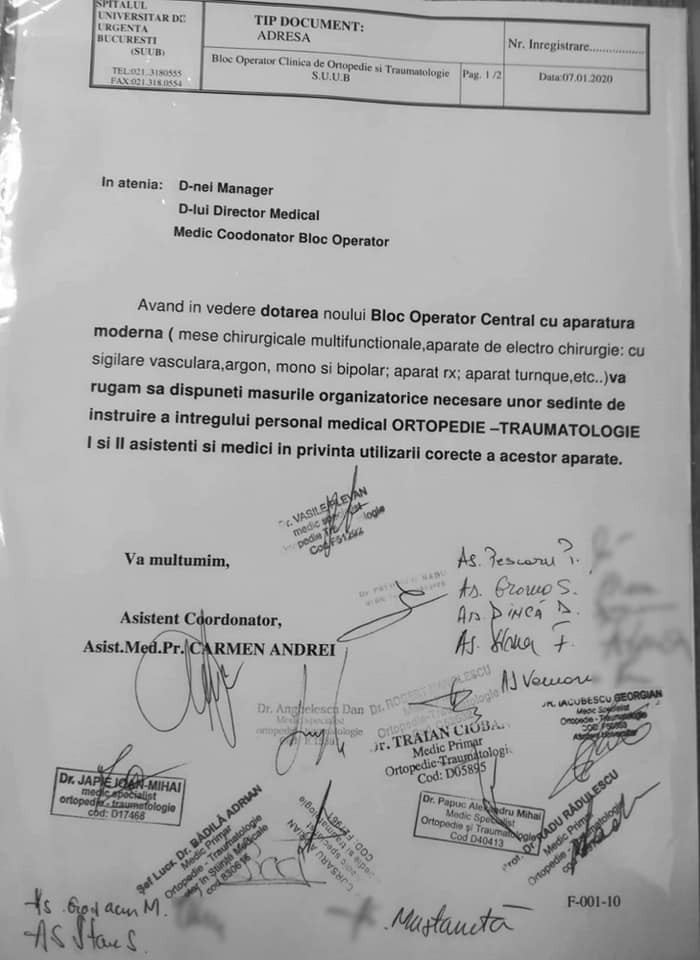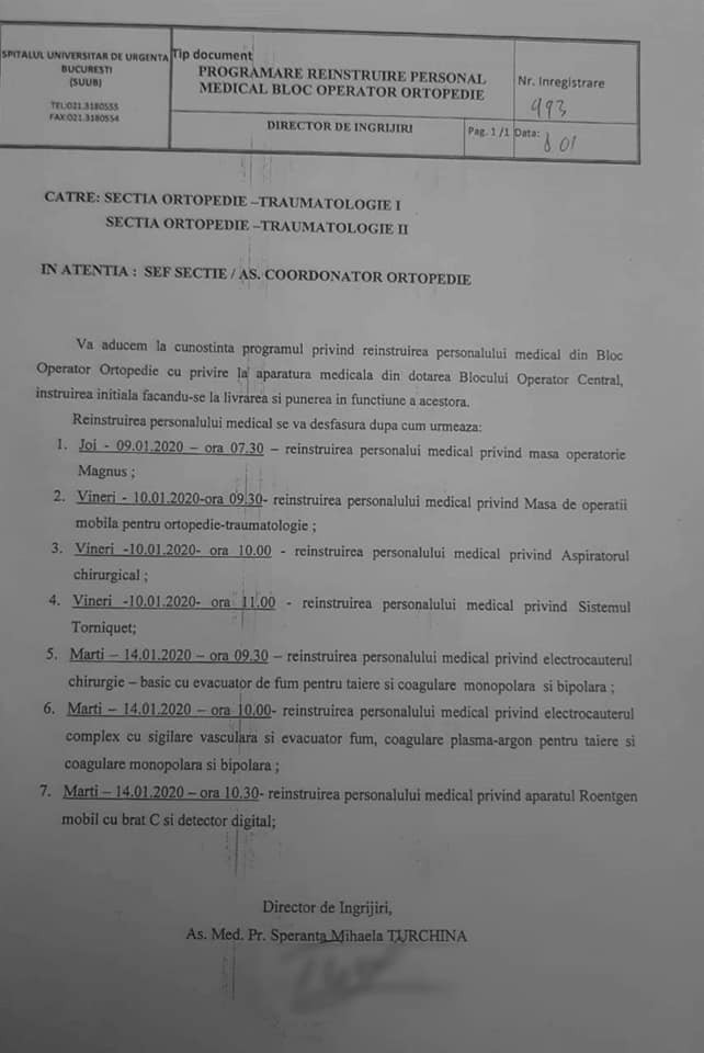 "In trimestrul IV al anului 2019, in functie de graficul de livrare si instalare a echipamentelor medicale s-au derulat si activitati de prezentare si instruire a personalului medical de profil chirurgical, inclusiv ortopedie, pentru utilizarea acestora, dovada fiind toate procesele verbale care au fost intocmite cu aceasta ocazie si unde asistentele coordonatoare si personalul Blocului Operator au semnat", explica Spitalul Universitar de Urgenta Bucuresti.