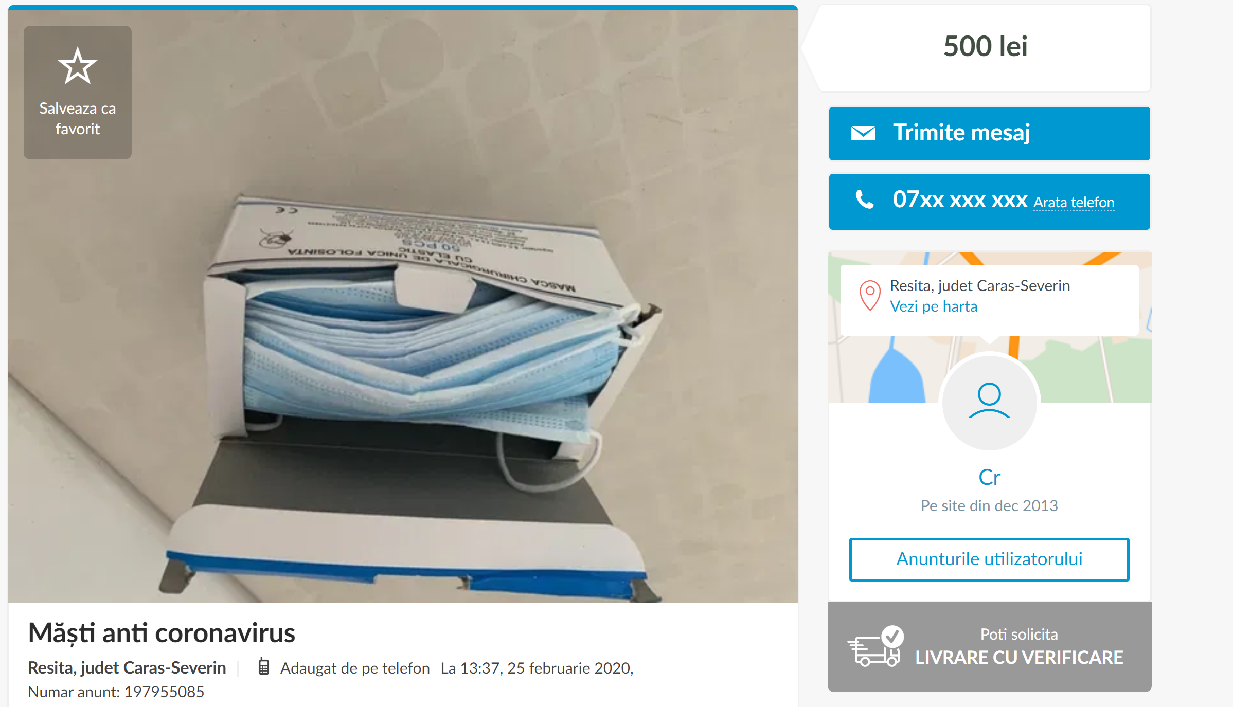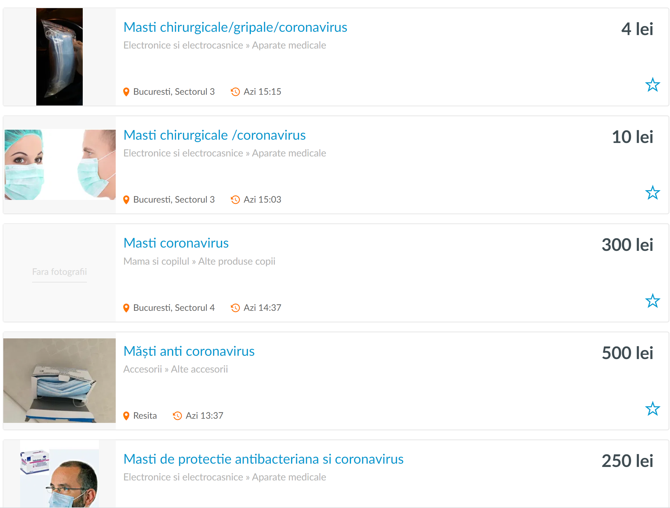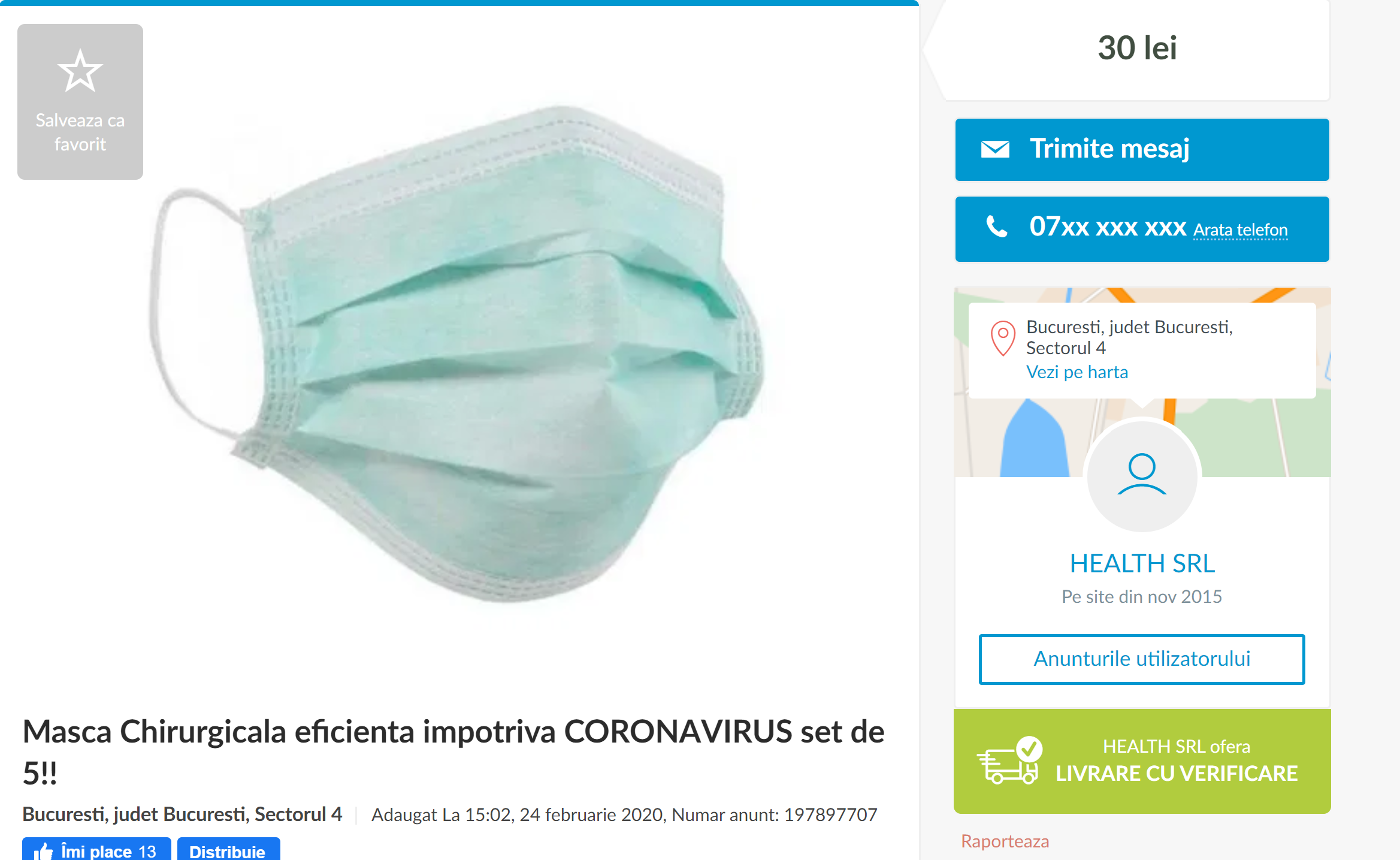 Însă, mai este o categorie care profită de isteria creată de coronavirus și de criza măștilor de protecție: persoanele fizice care vând pe platforme precum OLX. La o simplă căutare îți sar în ochi anunțurile, publicate în mare parte astăzi, cu măștile de protecție promovate ca fiind ”speciale împotriva coronavirusului”.