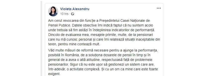 "Am cerut revocarea din funcţie a preşedintelui Casei Naţionale de Pensii Publice. Datele obiective îmi indică faptul că nu suntem acolo unde trebuia să fim astăzi în îndeplinirea indicatorilor de performanţă. Dincolo de evaluarea mea, mesajele primite, multe, de la pensionari care nu mă cunosc personal şi care îmi relatează situaţii inacceptabile din teren, pentru mine contează mult. Văd multe măsuri de reformă necesare pentru a ajunge la performanţa, posibilă în România, de a soluţiona dosarele de pensii în timp şi în general de a avea o altă atitudine, respectuoasă faţă de problemele pensionarilor. Sigur că nu este uşor să gestionezi un sistem care are, într-adevăr, o activitate complexă. Şi cu un om ca mine care este foarte exigent", a scris Violeta Alexandru, luni seara, pe pagina sa de Facebook.