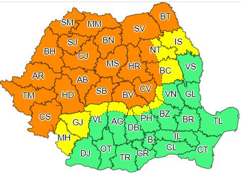 Judeţele ce se vor afla sub această avertizare sunt: Alba, Argeş, Arad, Bacău, Bihor, Bistriţa-Năsăud, Botoşani, Braşov, Buzău, Cluj, Caraş-Severin, Covasna, Dâmboviţa, Gorj, Hunedoara, Harghita, Iaşi, Mehedinţi, Maramureş, Mureş, Neamţ, Prahova, Sibiu, Sălaj, Satu Mare, Suceava, Timiş, Vâlcea şi Vrancea.